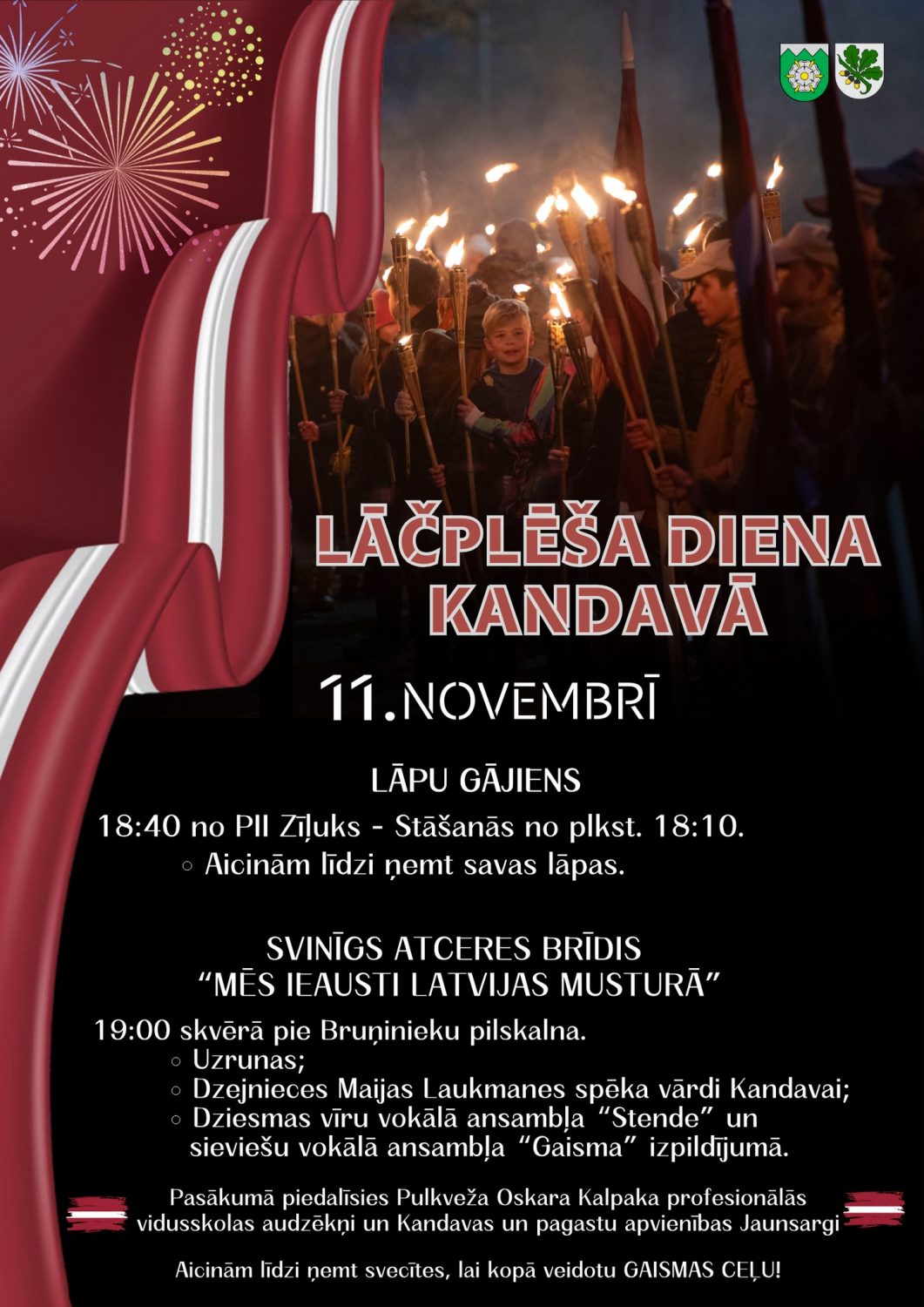 • Kandavas pilsētā – plkst. 18:40 Lāčplēša dienas lāpu gājiens. Pulcēšanās pie PII “Zīļuks” (Raiņa iela 14, Kandava) plkst. 18:10, pēc tam svinīgais piemiņas brīdis “Mēs ieausti Latvijas musturā” pie Bruņinieku pilskalna.