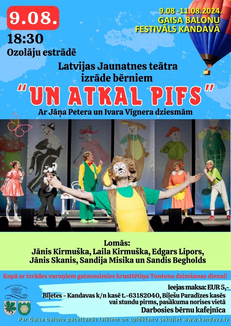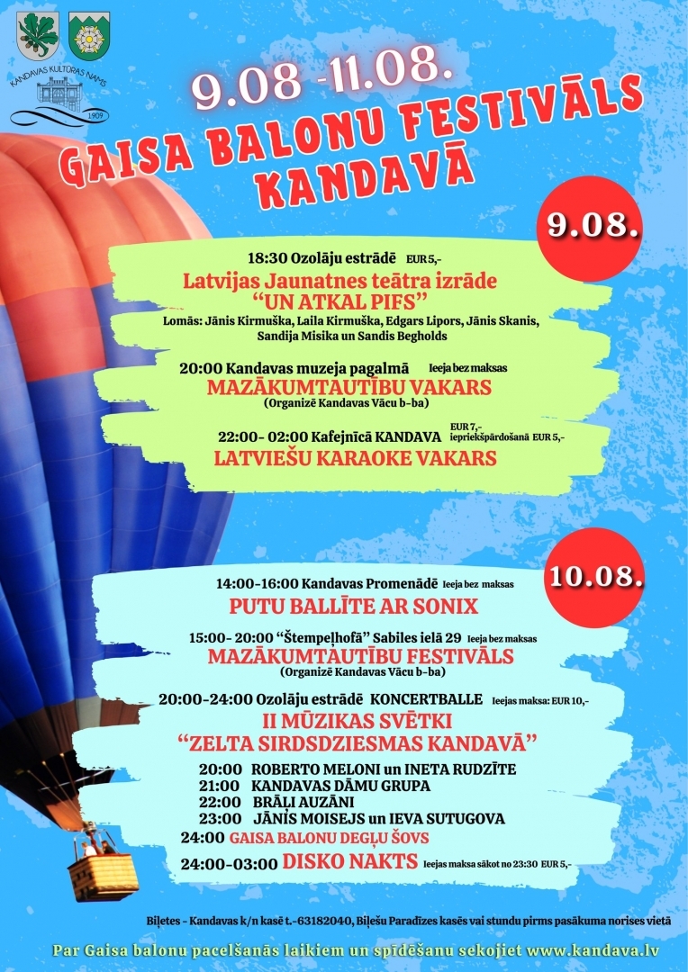 Kā šobrīd tiek ziņots, ņemot vērā lidošanai ne tik tīkamos laikapstākļus, Kandavas ikgadējā Gaisa balonu festivāla ietvaros tieši gaisa balonu pacelšanās tiek pārcelta. Taču svētki notiks un notiks ar pilnu jaudu, sākot jau no šodienas, kad 9. augustā 17.00 Kandavas muzeja pagalmā atklās Mazākumtautību festivālu, 22.00 – tie turpināsies ar karaoke vakaru viesnīcā «Kandava». Nākamajā rītā, 10. augustā, censoņi Kandavas lauksaimniecības tehnikuma stadionā pulcēsies no 10.00, bet agrā pēcpusdienā – 14.00, ikviens būs gaidīts pilsētas promenādē, kur būs ballīte bērniem. Turpināsies Mazākumtautību festivāls. Bet no 20.00 «Ozolāju» estrādē būs sirdsdziesmas Kandavā, kam sekos disko nakts.