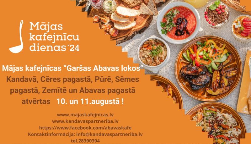 Atgādinām, ka ir klāt nedēļas nogale, kad Abavas lokos – lielākoties Tukuma novadā – būs iespēja baudīt maltīti Mājas kafejnīcās, kur kopumā savu veikumu piedāvās septiņi saimnieki. Plašāk ar piedāvājumu un pieteikšanās iespējām var iepazīties mājas lapā «Mājas kafejnīcas», kā arī facebook «Garšas Abavas lokos».
