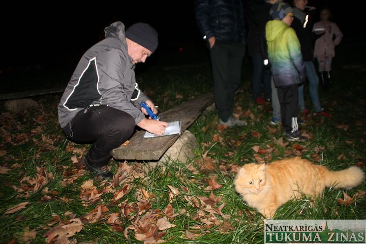 Helovīna skrējiens šogad Kandavā notika jau piekto gadu pēc kārtas. Ar gaismiņām un fototehniku bruņotie dalībnieki šoreiz bija aicināja startam pulcēties pie novada domes ēkas. Kā skaidroja viens no organizatoriem Uldis Vēciņš, tam bijusi arī stratēģiska nozīme – lai komandas varētu piereģistrēt vēl laternu apgaismojumā. Tālāk sacensību distance gan slīga lielākā vai mazākā tumsā un tikai no dalībnieku spējas orientēties pilsētā, bija atkarīgs tas, vai un kā viņi aizkļūs līdz norādītājiem objektiem. Žogi, ielu uzraksti, zīmīgi akmeņi un pat soliņš krūmos, ko dalībnieki teicās nekad iepriekš nav redzējuši, – tas viss un vēl vairāk ietilpa fotoorientēšanās sacensībās. Bet noslēgumā – neliela apbalvošanas ceremonija un ugunskurā ceptas desiņas Kandavas muzeja pagalmā. Pietika visiem. To skaitā runcim, kas atnāca palūkot, kas tad te šajā vakarā tā ālējas?…