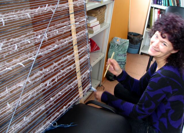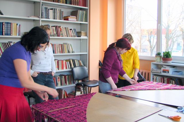 Tā par vakardienu sacīja tās desmit tukumnieces, kas audēju darbnīcā darināja sev šobrīd tik modernos ažūros trijstūra lakatus. Ja pie šādas atziņas dāmas palika pēc septiņu stundu stāvēšanas kājās, līkņāšanas un tupēšanas, piedevām vēl visu laiku griežot, stiepjot, verot un skaitot dzijas pavedienus, sienot mezglus un apdarinot bārkstis, tad… kādam varētu būt grūti noticēt šim apgalvojumam. Tāpēc – lai labāk stāsta fotogrāfijas, kurās redzama darbošanās un… apmierinātie smaidi – beigās! Tiesa gan,- šeit vairs nav visu dalībnieču, jo pirmais piecnieks, veiklākās un steidzīgākās „fotosesijas brīdī” ar saviem lakatiem jau bija devušās pilsētas ielās vai priecēt mājiniekus, palepoties ar patiesi skaistajiem darinājumiem.