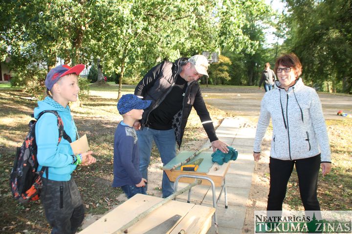 Pagājušajā piektdienā, 13. septembrī, ar atraktīvām izdarībām un desiņu cepšanu ugunskurā turpat Zantes skolas parkā tika svinēta Tēva diena. Vairāk gan Tēva diena izvērtās par ģimenes dienu, jo komandas, kurām bija jāpieveic septiņi skolotāju sagatavotie kontrolpunkti, grupējās visdažādākajās kombinācijās, to skaitā arī māsu un brāļu vai arī draugu kompānijās. Uzdevumi bija visdažādākie – sākot ar precīzu zāģēšanu, kur “uz aci” vajadzēja no koka sprunguļa atdalīt tieši piecus centimetrus, un beidzot ātrumsacensībām, kur konkrētā laika nogrieznī bija uz vienu pusi jāsagriež pļavā izkaisīti metāla vāciņi. Neskaitot pieminēto zāģēšanu, bija arī citu pavisam praktisku un ikdienā noderīgu prasmju demonstrējumi. Nu, piemēram, bērni kopā ar vecākiem varēja apgūt kartupeļu mizošanas pamatiemaņas vai izlocīt papīra kuģīti. Noslēdzot sacensību, kur par katru paveikto darbiņu varēja saņemt zīmodziņus, bija iespēja savu tēti, mammu vai citu līdznācēju pārģērbt par kādu pasaku tēlu.