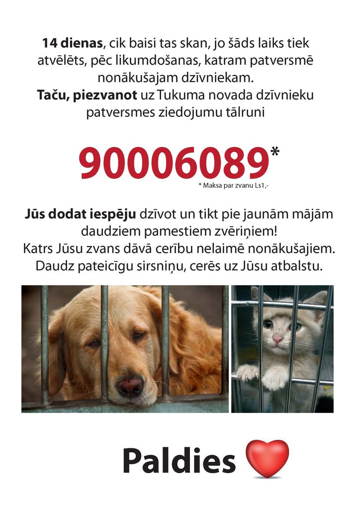 Apmeklējiet Tukuma dzīvnieku patversmi Klusajā ielā 5 un atrodiet savu DRAUGU! Uzziņas pa tālruni 26237913 (LMT) vai 26885916 (Tele2)