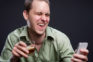 A laughing drunk man spills his drink while texting on his cell phone.