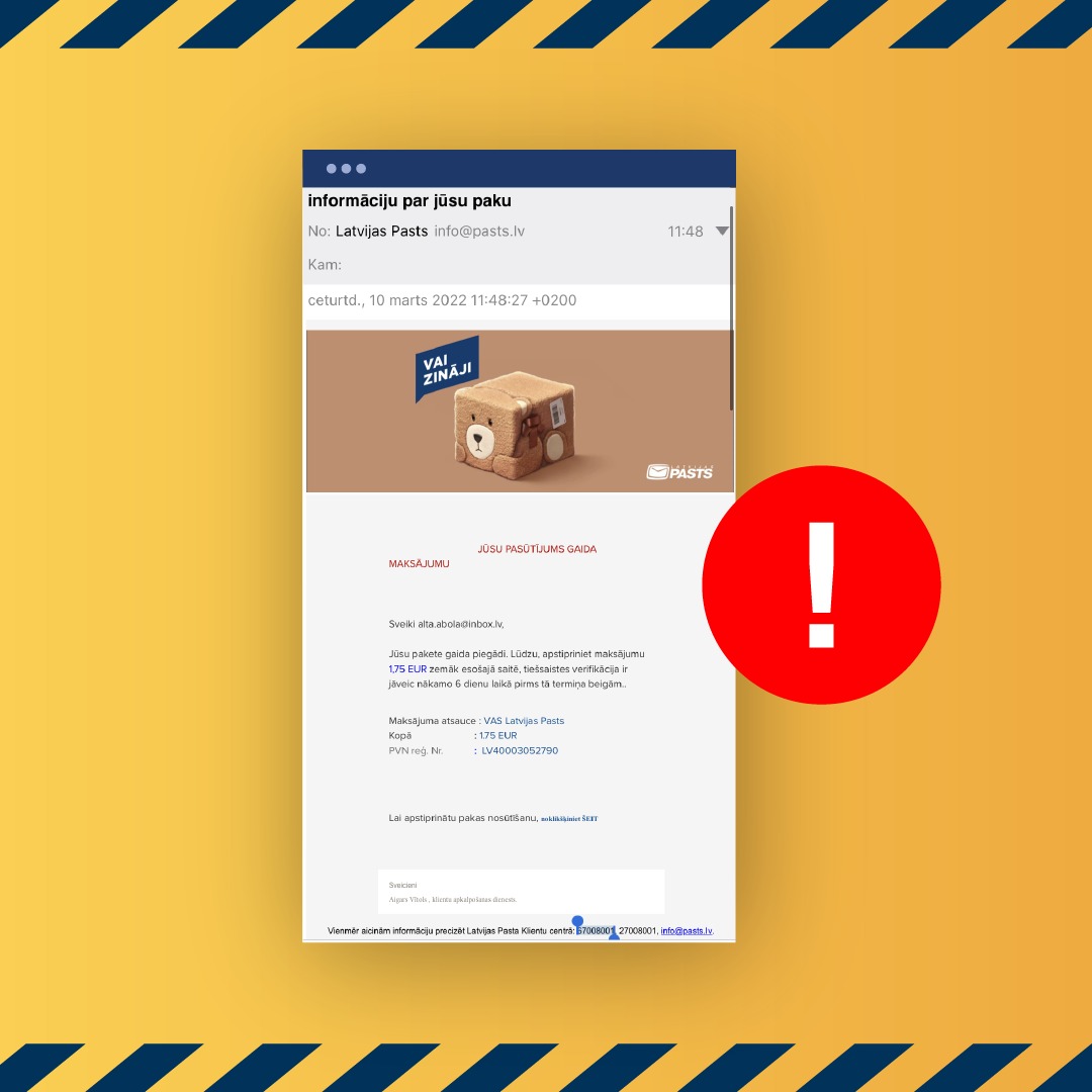 Aicinām vienmēr pārbaudīt sūtītāja e-pasta adresi, jo Latvijas Pasta e-pasta adreses vienmēr beidzas ar @pasts.lv.