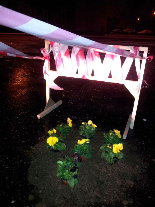 Bet šorīt neticēju savām acīm!!! Tukumā uz Rīgas ielas bedrē laksti krāsainiem ziediem - un zīme: REDZI? BEDRE, apkārt vel drošības lenta!!!