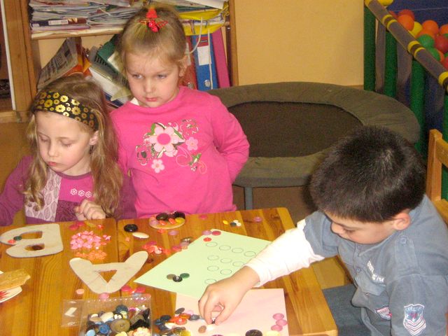 Pogas ir ļoti daudzveidīgi pielietojamas, un, kā pierādījās arī šai pēcpusdienā, bērniem patīk ar pogām darboties. Vienmēr tikai jāatceras, ka pavisam maziem bērniem ir vēlme visu bāzt mutē, tāpēc jādomā par bērnu drošību un nedrīkst dot bērniem spēlēties ar sīkiem priekšmetiem, ja vien paši nesekojat līdzi katrai mazuļa kustībai. Es no saviem skolas laikiem atceros, ka skolotāja mēdza aizrādīt, ja kāds neskaitīja galvā, bet palīgā ņēma pirkstus. Skaitļu summēšana galvā, protams, ir augstāka sagatavotības pakāpe pie nosacījuma, ja tas nav atmiņas treniņš, bet iztēles spēja. Bet, lai bērns spētu galvā iztēloties skaitļu daudzumu, viņam ir vajadzīga pieredze, kas gūta, darbojoties ar priekšmetiem (kociņiem, pupām, zirņiem, konfektēm, pogām, utt.). Prakse rāda, ka vismazāk bērni kļūdās, skaitot, vai dalot konfektes. Tas pierāda, ka priekšmetiem, ar kuru palīdzību mēs gribam nostiprināt matemātiskos priekšstatus bērniem, ir būtiska nozīme. Pogu daudzveidība ir tik plaša, ka droši var apgalvot, ka tās ir piemērotas visām gaumēm. Šūpulīša bērni veica vairākus domāšanas operāciju veicinošus uzdevumus. Pogas tika grupētas pēc kādas noteiktas pazīmes (lielās un mazās, tumšās un gaišās.) Pogas tika liktas no mazākās uz lielāko, no gaišākās uz tumšāko (seriācijas operācija). Ar uzlikšanas paņēmienu tika veidotas skaitļu virknes no pogām, kas ir būtiski, lai apgūtu izpratni par skaitļa daudzumu. Tas savukārt vedina salīdzināt skaitļu rindas, un apgūt jēdzienus: "vairāk", "mazāk", "tikpat" un tālāk jau – "par cik vairāk", "par cik mazāk". Visu, protams, nav iespējams apgūt vienā pēcpusdienā, bet svarīgi, ka vecākiem ir priekšstats, kā bērni apgūst matemātiku pirmsskolas vecumā. Bērni kārtoja pogas uz ģeometriskām figūrām.