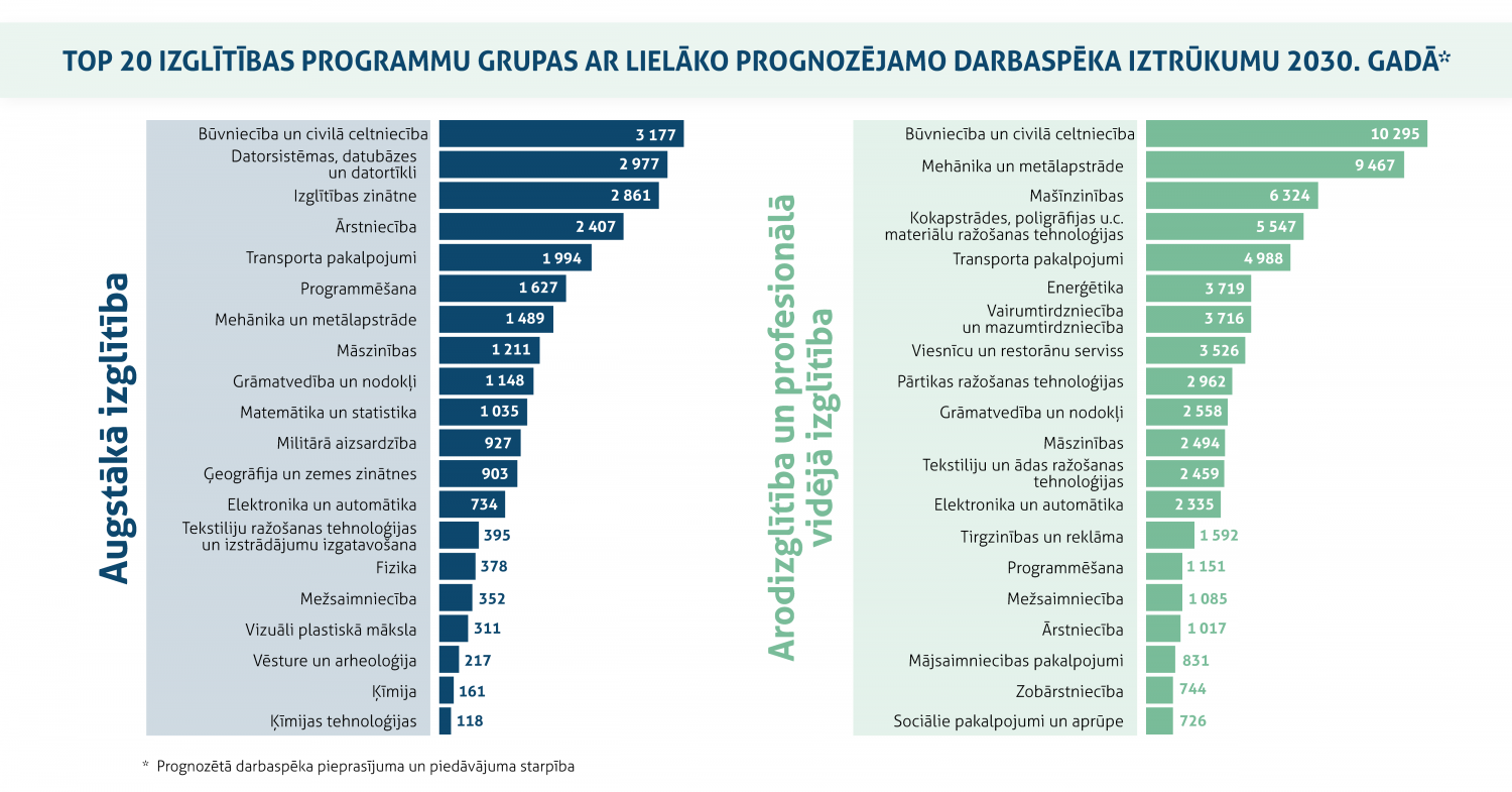 Saskaņā ar Ekonomikas ministrijas darba tirgus prognozēm, būtiskākais darbaspēka iztrūkums veidosies pēc speciālistiem ar izglītību eksaktajās zinātnēs. 2030. gadā augstākās kvalifikācijas dabaszinātņu, IKT un inženierzinātņu speciālistu iztrūkums var pārsniegt 9 tūkstošus darbinieku. Savukārt darbaspēka nepietiekamība ar profesionālo vidējo izglītību var sasniegt gandrīz 70 tūkstošus darbinieku, īpaši izteikts darbaspēka trūkums var veidoties pēc speciālistiem ar profesionālo izglītību inženierzinātnēs un ražošanas virzienos.