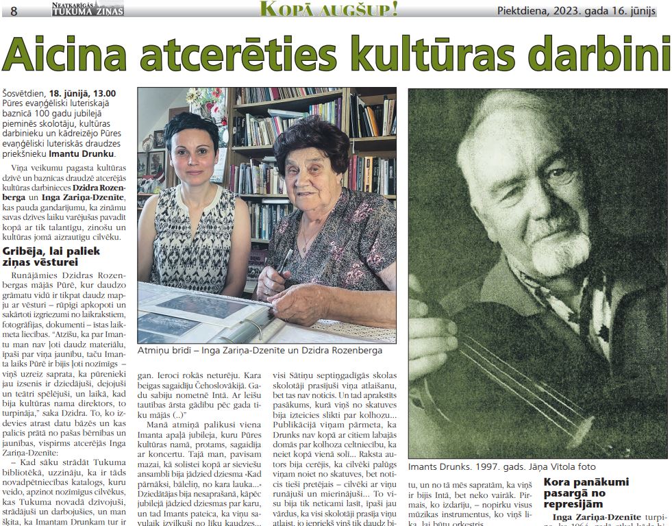 – Kad sāku strādāt Tukuma bibliotēkā, uzzināju, ka ir tāds novadpētniecības katalogs, kuru veido, apzinot nozīmīgus cilvēkus, kas Tukuma novadā dzīvojuši, strādājuši un darbojušies, un man šķita, ka Imantam Drunkam tur ir jābūt. Bet… kam vien Pūrē jautāju par viņa jaunības laiku, neviens neko nevarēja pateikt. Kā izrādījās, I. Drunka par sevi neko daudz nebija stāstījis. Tad sāku informāciju meklēt periodikā un citās datu bāzēs. Un man laimējās satikt Imanta mazmeitu Lindu un iegūt Imanta sievas Hildas savāktos materiālus.