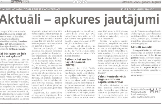 Šādu jautājumu preses konferencē uzdevām, ņemot vērā, ka Jaunpilī un Lapmežciemā apkurei izmanto gāzi, ar kuras iegādi varētu būt problēmas. Pašvaldības vadītājs skaidroja, ka līgumi ir noslēgti, bet vai būs gāze – nav zināms: “Mums nav tādu tvertņu, kur šajos pagastos uzglabāt gāzi, pat ja rastos iespēja to nopirkt, līdz ar to jāpaļaujas uz to gāzi, kas tiks piegādāta pa cauruļvadiem. Varam piepildīt propāna gāzes tvertnes, bet arī tas būtu tikai tik, cik ietilpst tvertnēs. Lapmežciemā esam iesnieguši projektu valsts izsludinātajā konkursā, lai pārietu uz granulu apkuri; redzēsim, kāds būs risinājums. Ministrija solīja, ka viss notiks ātri, bet redzam, ka tik ātri viss tomēr nenotiek – apkures sezona drīz būs klāt, bet mēs vēl nezinām projekta iznākumu, turklāt šie katli vēl ir jānopērk.”