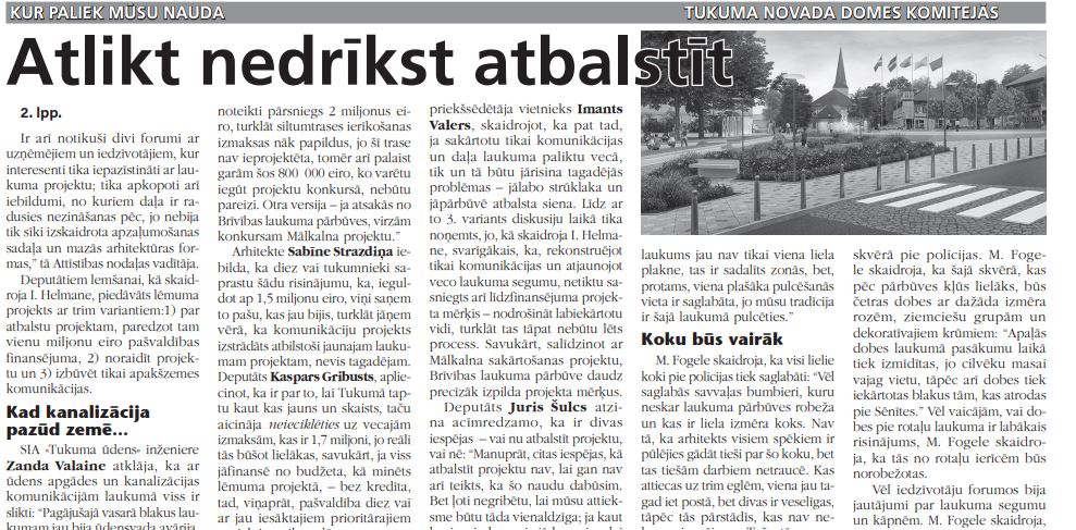 Arhitekte Sabīne Strazdiņa iebilda, ka diez vai tukumnieki saprastu šādu risinājumu, ka, ieguldot ap 1,5 miljonu eiro, viņi saņem to pašu, kas jau bijis, turklāt jāņem vērā, ka komunikāciju projekts izstrādāts atbilstoši jaunajam laukumam projektam, nevis tagadējam. Deputāts Kaspars Gribusts, apliecinot, ka ir par to, lai Tukumā taptu kaut kas jauns un skaists, taču aicināja neieciklēties uz vecajām izmaksām, kas ir 1,7 miljoni, jo reāli tās būšot lielākas, savukārt, ja viss jāfinansē no budžeta, kā minēts lēmuma projektā, – bez kredīta, tad, viņaprāt, pašvaldība diez vai ar jau iesāktajiem prioritārajiem projektiem tiks galā.