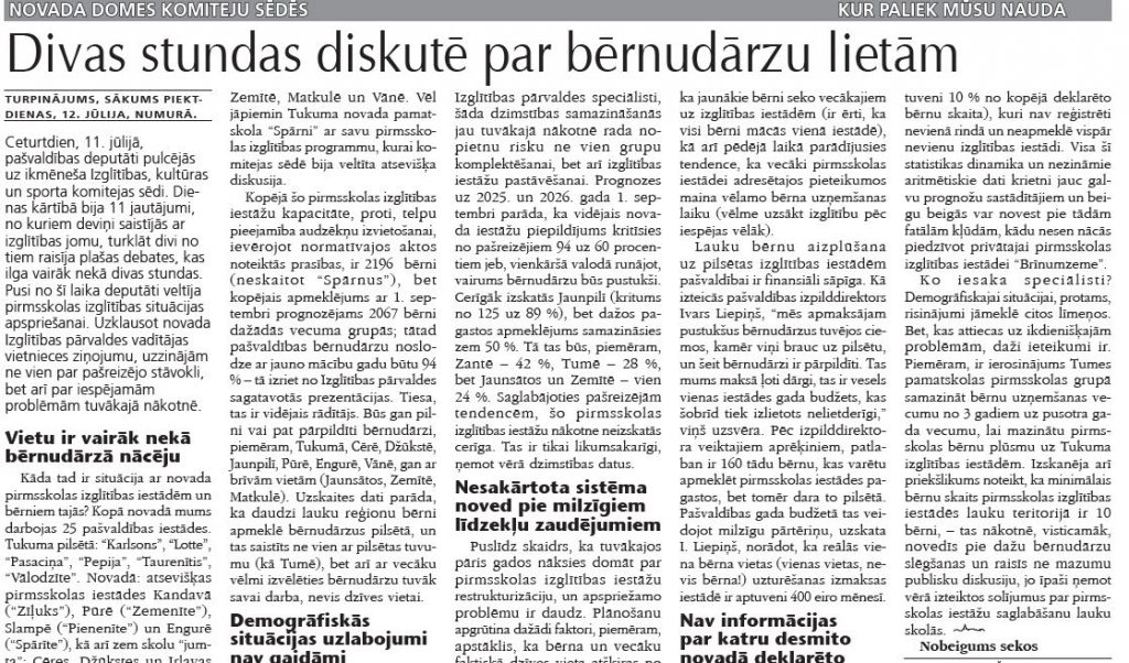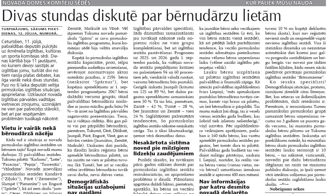 Kāda tad ir situācija ar novada pirmsskolas izglītības iestādēm un bērniem tajās? Kopā novadā mums darbojas 25 pašvaldības iestādes. Tukuma pilsētā: “Karlsons”, “Lotte”, “Pasaciņa”, “Pepija”, “Taurenītis”, “Vālodzīte”. Novadā: atsevišķas pirmsskolas iestādes Kandavā (“Zīļuks”), Pūrē (“Zemenīte”), Slampē (“Pienenīte”) un Engurē (“Spārīte”), kā arī zem skolu “jumta”: Cēres, Džūkstes un Irlavas pamatskolā, Jaunpils vidusskolā, Kandavas reģionālajā pamatskolā, Lapmežciema pamatskolā, Pūres pamatskolas Jaunsātu filiālē, Sēmes sākumskolā, Smārdes, Tumes un Zantes pamatskolā, kā arī Zemītes sākumskolā ar trim filiālēm – Zemītē, Matkulē un Vānē. Vēl jāpiemin Tukuma novada pamatskola “Spārni” ar savu pirmsskolas izglītības programmu, kurai komitejas sēdē bija veltīta atsevišķa diskusija.