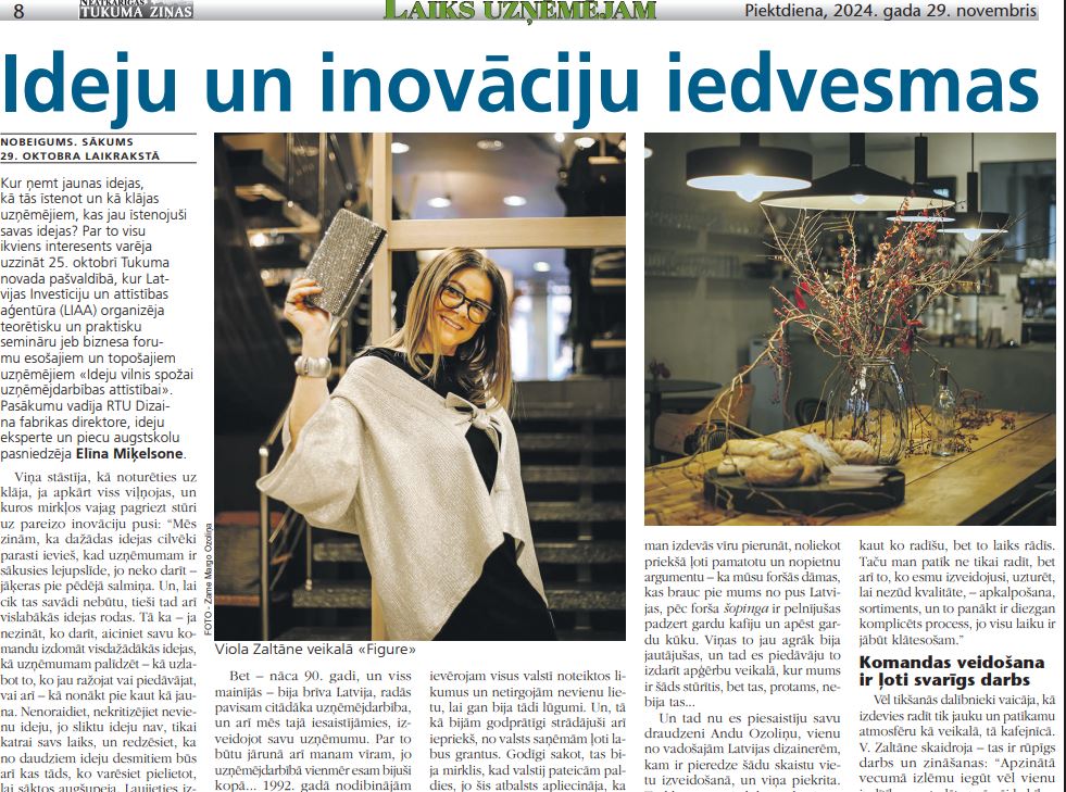 Tā, stāstot savu pieredzes stāstu par veikalu «Figure» un kafejnīcu «Malta kappija» Tukumā, Pils ielā 7a, atzina SIA «Ieva 92» valdes priekšsēdētāja Viola Zaltāne. Viņa teica, ka nav sagatavojusi prezentāciju: “Neslēpšu, – neesmu jauno laiku cilvēks, kas savas domas izsaka prezentācijā. Pēdējoreiz prezentēju savu diplomdarbu augstskolā, un zinu, ko tas nozīmē.
