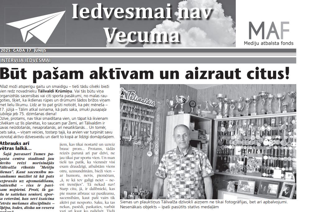 Iedvesmai nav vecuma Projekti Iedvesmai nav vecuma/jūnijs/ ntz.lv 17.06.2025 0 NTZ_250617_Iedvesma Dalies sociālajos tīklos: Click to share on Facebook (Opens in new window) Facebook Click to share on X (Opens in new window) X Nav vēl komentāru. Pievieno komentāru Atcelt atbildi Saglabājiet manu vārdu, e-pasta adresi un vietni šajā pārlūkprogrammā nākamajai reizei, kad vēlēšos pievienot komentāru. Vārds Komentārs * Pievienot komentāru Līdzīgi raksti Iedvesmai nav vecuma (oktobris) ntz.lv 31.10.2025 0 Iedvesmai nav vecuma (septembris) ntz.lv 19.09.2025 0 Lemj par naudu un štatu sarakstiem ntz.lv 27.08.2025 0 Par audzēkņiem un cipariem ntz.lv 19.08.2025 0 Par cipariem un audzēkņiem ntz.lv 15.08.2025 0