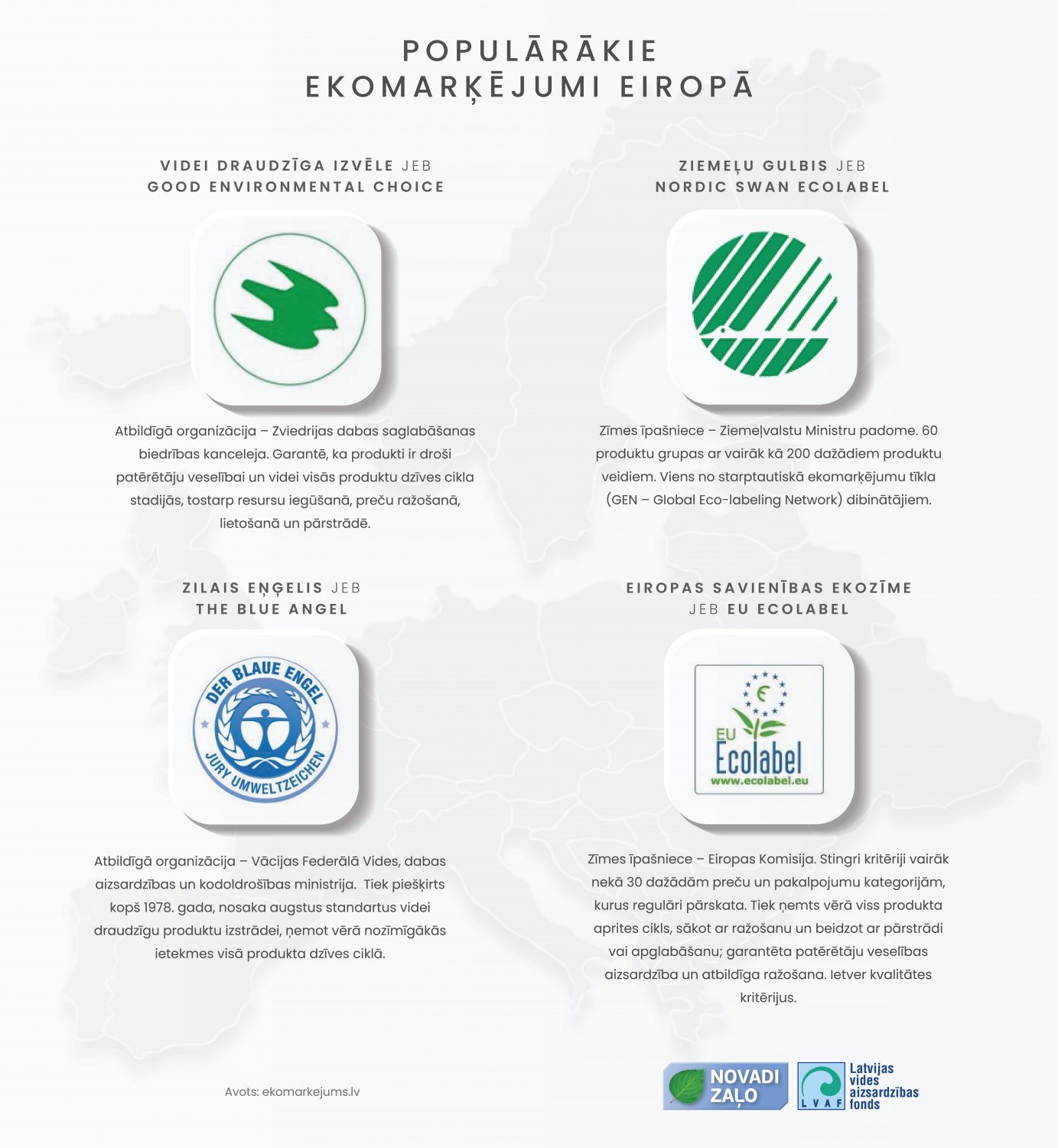 -Stāvot veikalā pie plaukta, mums parasti nav ne laika, ne iespēju pārbaudīt katru produktu, lai novērtētu, cik labs vai slikts tas ir videi un mums. Tāpēc bieži vien kļūstam par maldināšanas upuriem, uzķeroties uz labi mērķētiem mārketinga trikiem, tādiem faktiski jau nekādi nepārbaudāmiem un ne ar ko nepierādītiem uzrakstiem kā “Videi draudzīgs!”, “Dabiskas sastāvdaļas!”, “Bez toksīniem”, “Bez e-vielām!”. Vai arī uz kādu vizuālu norādi – marķējumu, kas gan ar savu zaļo krāsu, gan kāda auga vai dzīvnieka attēlu, ko, iespējams, papildina tādi vārdi kā eko, bio un zaļš, tiecas mūs pārliecināt, ka nu gan mums būs iespēja iegādāties kaut ko sev un dabai ļoti noderīgu un veselīgu. Un te nu nonākam pie stāsta par ekomarķējumu, kas turklāt ir uzticams marķējums. Tā ir visdrošākā metode, kā noteikt kāda produkta atbilstību visaugstākajiem vidi un cilvēka veselību saudzējošiem produktu un ražošanas standartiem.