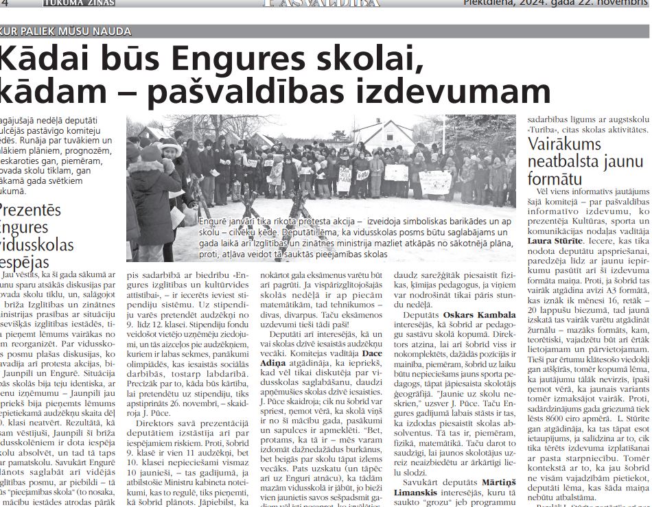 Jau vēstīts, ka šī gada sākumā ar jaunu sparu atsākās diskusijas par novada skolu tīklu un, salāgojot tā brīža Izglītības un zinātnes ministrijas prasības ar situāciju atsevišķās izglītības iestādēs, tika pieņemt lēmums vairākas no tām reorganizēt. Par vidusskolas posmu plašas diskusijas, ko pavadīja arī protesta akcijas, bija Jaunpilī un Engurē. Situācija abās skolās bija teju identiska, ar vienu izņēmumu – Jaunpilī jau iepriekš bija pieņemts lēmums nepietiekamā audzēkņu skaita dēļ 10. klasi neatvērt. Rezultātā, kā esam vēstījuši, Jaunpilī šī brīža vidusskolēniem ir dota iespēja skolu absolvēt, un tad tā taps par pamatskolu. Savukārt Engurē plānots saglabāt arī vidējās izglītības posmu, ar piebildi – tā būs “pieejamības skola“ (to nosaka, ja mācību iestādes atrodas pārāk tālu no citām skolām), kas pieļauj atkāpes no ministrijas noteiktā minimālā audzēkņu skaita, proti, 60 skolēniem vidusskolas posmā.