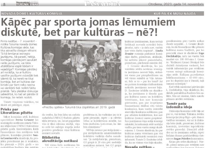 Pirms nedēļas – 7. novembrī – notika Tukuma novada domes Kultūras komisijas sēde, kas tika aizvadīta diezgan vētraini. Tā kā lemšanai iesniegto jautājumu, kā parasti, nebija, komisijas pārstāvjiem savukārt radās jautājums, vai šāda atsēdēšana vispār kādam ir vajadzīga?! Komisijas pārstāvji arī norādīja, ka ar kultūru saistītie jautājumi visbiežāk tiek izlemti tā, ka nereti ne tikai komisija, bet arī kultūras darbinieki par tiem neko nezina vai vienkārši tiek nolikti fakta priekšā. Taču plašākai diskusijai sabiedrībā, ko tad arī pārstāv šī komisija, tie netiek nodoti.