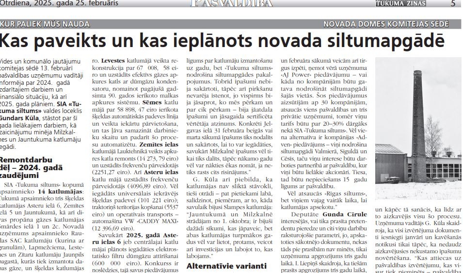 Pagājis gads kopš 2024. gada februārī Tukuma novada pašvaldības deputāti tika informēti par iespējamajiem apkures risinājumiem Jauntukumā. Vienlaikus šī gada laikā bija nācies domāt, ko darīt ar Milzkalnes katlu māju, kuru, līdzīgi kā Jauntukumā, pašvaldībai tika piedāvāts iegādāties.