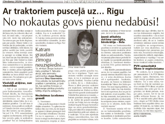 Vēl viena no lauksaimnieku prasībām ir izveidot un apstiprināt Eiropas Komisijā vienkāršu atbalsta sistēmu, samazinot pasākumu skaitu un sadrumstalotību. Vaicāta, vai jaunajā plānošanas periodā bijis vieglāk vai sarežģītāk pieteikties atbalstam, D. Vasermane skaidroja, ka līdz 2023. gadam sistēma bijusi skaidra: “Bija skaidrs pamatmaksājums un tas, ko var saņemt papildus, bet jaunajā sistēmā skaidrība bija maza – ir sešas ekoshēmas, kurām vēl ir apakšpunkti… Sarakstīju, kā pratu, un braucu uz klātienes konsultāciju Talsos, kur lūdzu padomu. Tur man laipni palīdzēja, un 10 minūšu laikā viss bija kārtībā, bet tā īsti saprotams, kas un par ko tiek maksāts, tā arī nepalika. Zinu, ka bija zemnieki, kas pieteicās tikai uz pamata atbalstu, un tikai tādēļ, ka neizprata jauno sistēmu, nepieteicas uz to atbalstu, kādu būtu varējuši saņemt.”