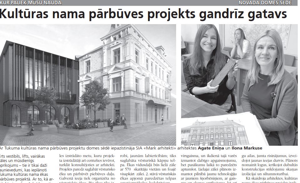 Arhitekte Ilona Markuse stāstīja, ka Tukuma kultūras nama senās ēkas fasādi ir paredzēts restaurēt, sakārtojot pārbūvētas logu ailas, jumta risinājumus, izveidojot jaunas ieejas durvis. Plānots nomainīt logus, ierīkojot dubultās konstrukcijas stiklojumu skaņas izolācijai un siltumnoturībai.