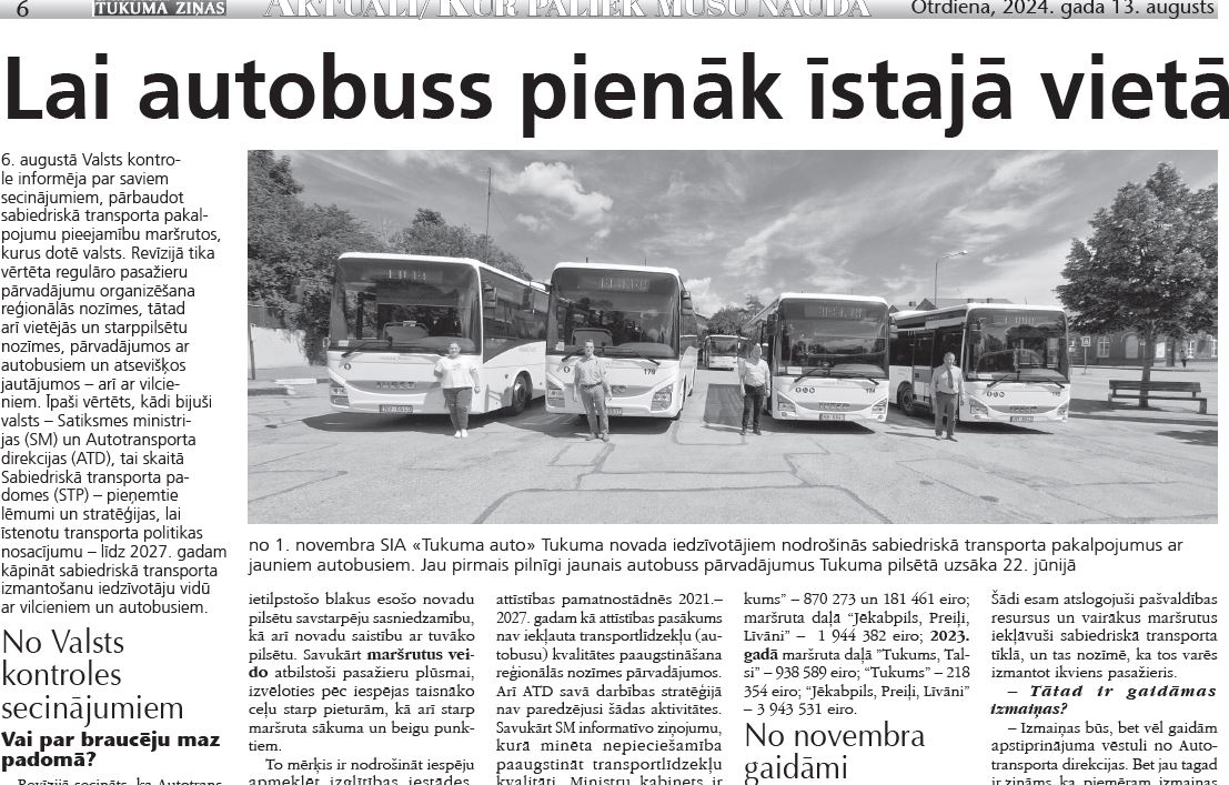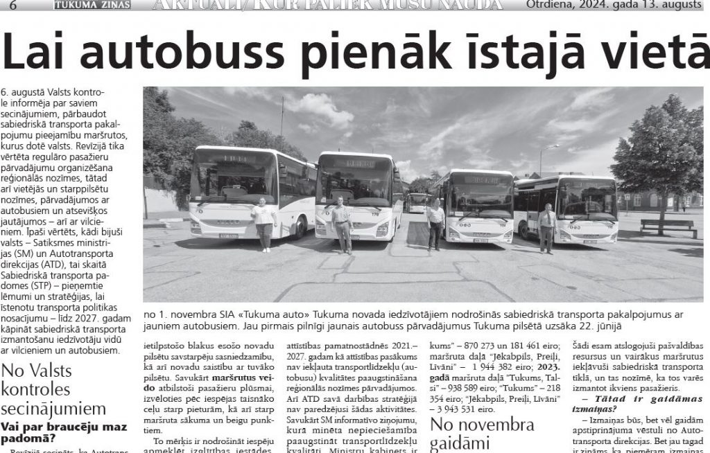 Par to, vai SIA «Tukuma auto» izdodas apzināt iedzīvotāju vajadzības un izveidot rentablus maršrutus, kā arī – kāda ir autobusu kvalitāte un kādi uzlabojumi gaidāmi, runājām ar uzņēmuma direktoru Rolandu Melderi. Viņš gan atzina, ka ar revīzijas atzinumu lielās aizņemtības dēļ nav paguvis iepazīties, taču par to, ka viņa vadītā uzņēmuma pārstāvētā nozare revidēta, bija informēts.