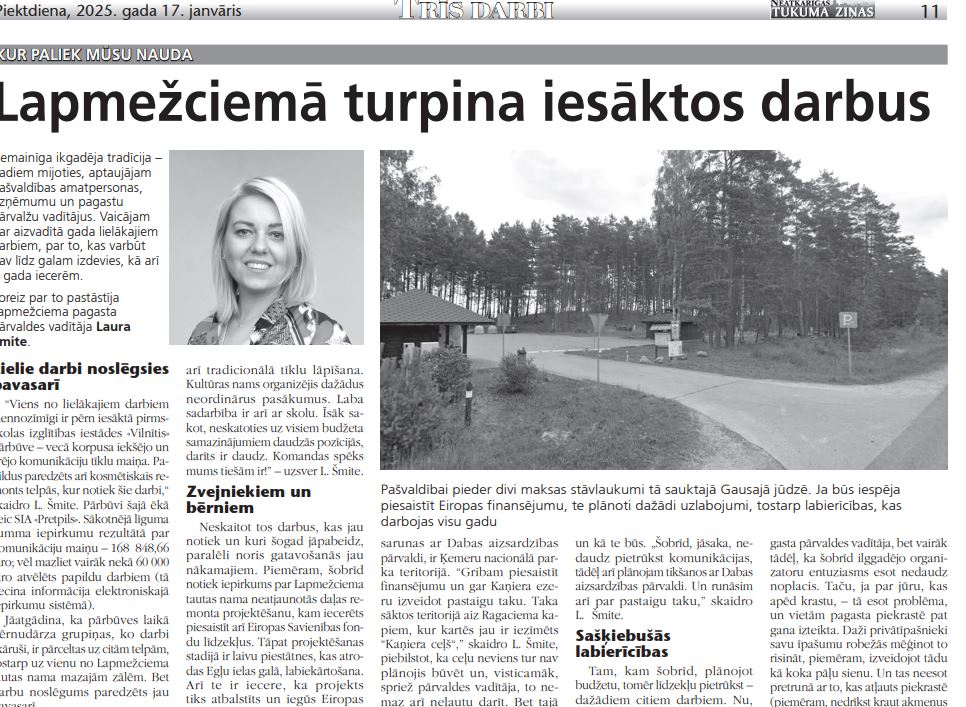 “Vēl varam lepoties ar pagājušajā gadā paveiktajiem saimnieciskajiem darbiem, jo tiešām to bijis daudz – tai skaitā zaru zāģēšana, vētras radīto seku likvidēšana, daudzu meliorācijas sistēmu tīrīšana. Katrs jau daudz darījis! Muzejs strādāja, lai kultūrvēsturiskajā mantojuma sarakstā būtu iekļauta arī tradicionālā tīklu lāpīšana. Kultūras nams organizējis dažādus neordinārus pasākumus. Laba sadarbība ir arī ar skolu. Īsāk sakot, neskatoties uz visiem budžeta samazinājumiem daudzās pozīcijās, darīts ir daudz. Komandas spēks mums tiešām ir!” – uzsver L. Šmite.