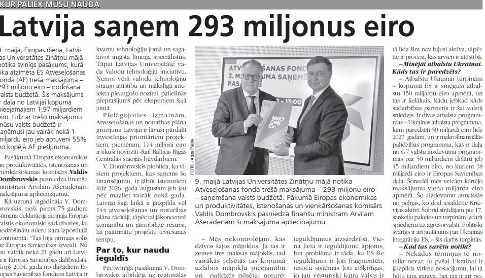 Kā uzrunā atgādināja V. Dombrovskis, tieši pirms 75 gadiem Šūmana deklarācija aicināja Eiropas valstis ekonomiski sadarboties, lai nodrošinātu mieru kara izpostītajā kontinentā: “Tas bija pirmais solis uz Eiropas Savienības izveidi. Nu jau vairāk nekā 21 gadu arī Latvija ir Eiropas Savienības dalībvalsts. Kopš 2004. gada no dažādiem Eiropas Savienības fondiem Latvija ir saņēmusi ļoti nozīmīgu finansiālo atbalstu – vairāk nekā 18 miljardus eiro. Šie līdzekļi ir ļāvuši valsti modernizēt, ievērojami attīstīt tautsaimniecību un, pats galvenais, uzlabot iedzīvotāju labklājību.” Komisārs skaidroja, ka Latvijas ekonomikas Atveseļošanas un noturības plāns ietver ļoti plašu reformu un investīciju loku, kas palīdz īstenot tautsaimniecības zaļo un digitālo transformāciju, veicināt inovācijas un uzņēmējdarbību, stiprināt sociālos pakalpojumus un veselības aprūpi. Piemēram, ar Atveseļošanas fonda līdzekļiem šī trešā maksājuma ietvaros skolām visā Latvijā piegādāts vairāk nekā 35 000 klēpjdatoru. Tas ļauj uzlabot mācību procesu un atbalstīt skolēnus no trūcīgākām ģimenēm, mazinot nevienlīdzību. Pateicoties Atveseļošanas fonda investīcijām, vairākās Latvijas pilsētās notiek zemas īres daudzdzīvokļu namu būvniecība – tie būs gandrīz 450 jauni, energoefektīvi dzīvokļi, kas palīdzēs Bauskā, Valmierā, Jelgavā, Tukumā, Ventspilī, Cēsīs un Alūksnē risināt mājokļu pieejamības problēmu, kas pašreiz kavē šo pilsētu ekonomisko attīstību. Ar Atveseļošanas fonda palīdzību tiek stiprināta izglītība, iedzīvotāju prasmes, kā arī Latvijas pētniecības un inovāciju sistēma. No Atveseļošanas fonda kopumā 82,5 miljoni eiro ir atvēlēti Augstākās izglītības un zinātnes izcilības un pārvaldības reformai, kas šobrīd tiek īstenota. Savukārt 17 miljoni eiro ir piešķirti trim augsta līmeņa digitālo prasmju apguves projektiem. Viens no tiem ir Latvijas Universitātes vadībā izveidotā Kvantu tehnoloģiju iniciatīva. Šis projekts palīdz attīstīt zināšanu bāzi kvantu tehnoloģiju jomā un sagatavot augsta līmeņa speciālistus. Tāpat Latvijas Universitāte vada Valodu tehnoloģiju iniciatīvu. Ņemot vērā valodu tehnoloģiju straujo attīstību un mākslīgā intelekta pieaugošo nozīmi, palielinās pieprasījums pēc ekspertiem šajā jomā.