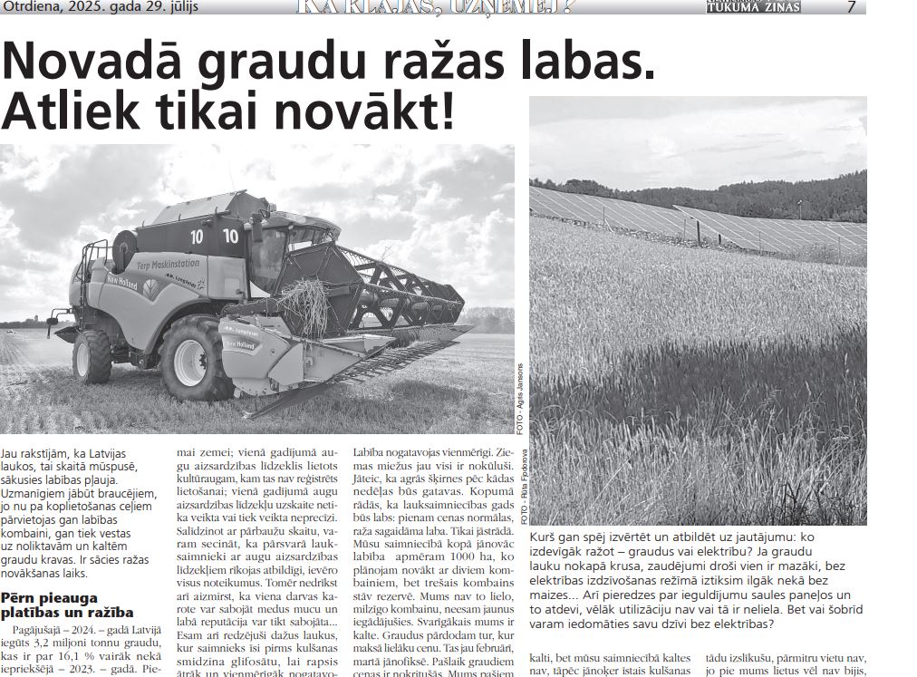 Pagājušajā – 2024. – gadā Latvijā iegūts 3,2 miljoni tonnu graudu, kas ir par 16,1% vairāk nekā iepriekšējā – 2023. – gadā. Pieaug graudaugu sējumu platības, tās aizsniedz 800,8 tūkstošus hektāru. Tiesa gan, braucot pa lauku ceļiem, nu visai bieži redzam, ka agrākajos labības laukos novietoti saules paneļi. To, vai šogad labības sējumu platības pieaug, vai tomēr samazinās, varēsim konstatēt tikai pēc statistikas datu apkopošanas. Pērn vidējā graudaugu ražība valstī aizsniedza 39,4 cnt no hektāra. Šogad daudzviet Latvijā postu labības laukiem nodarījušas lietavas. Tāpēc diez vai uz pagājušā gada kopražu Latvijā varam cerēt, kaut gan mūspusē labība augusi un briedusi gana labi.