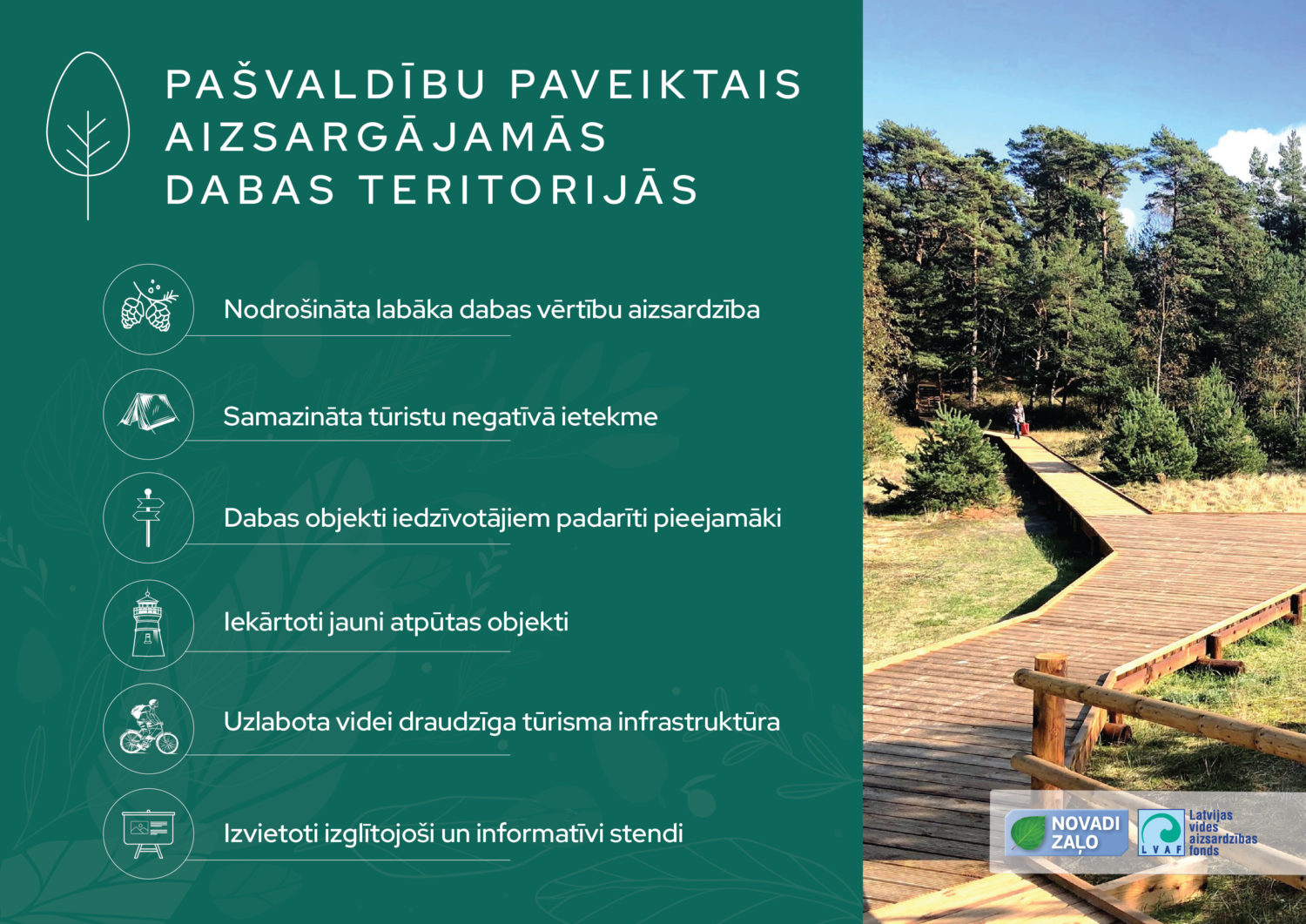 Noteikti arī jāmin, ka sadarbībā ar Carnikavas novada pašvaldību uzlabota tūrisma infrastruktūra dabas parkā “Piejūra” – ir izveidota promenāde uz jūru 1800 metru garumā, uzstādīti pludmales labiekārtojuma elementi, kā arī ierīkoti auto stāvlaukumi organizētai apmeklētāju plūsmas virzībai dabas parkā.