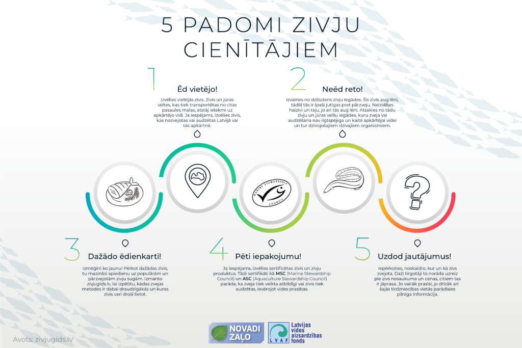 ANO dati liecina, ka ap 90% pasaules savvaļas zivju krājumu tiek pārzvejoti vai ir sasnieguši maksimāli pieļaujamo ilgtspējīgas zvejas apjomu. Lai mēs arī nākotnē varētu ēst zivis, ļoti svarīgi ir jūrās, ezeros un ūdenstilpēs saglabāt to bioloģisko daudzveidību. Izzvejojot kādu zivju sugu, mēs nezaudējam tikai to – tā tiek izjaukts viss ekosistēmas līdzsvars, kā arī negatīvi ietekmētas daudzas citas sugas. Arī zivju audzēšana rada vides problēmas, no kurām viena ir citu ūdens dzīvnieku ieguve, lai nodrošinātu barību audzētajām zivīm, skaidro Pasaules Dabas fonds (PDF), kas izstrādājis “Zivju gidu”, lai palīdzētu saprast, kuras zivis ēst, bet no kurām labāk atteikties. Tajā sniegta informācija par lielāko daļu Latvijā nopērkamo populāro zivju sugām. Tās apzīmētas atšķirīgās krāsās pēc luksofora principa, proti, zaļā vēsta – “Ēdiet uz veselību!”, dzeltenā – “Uzmanīgi! Painteresējieties un padomājiet!”, bet sarkanā aicina – “Nepērciet!”.