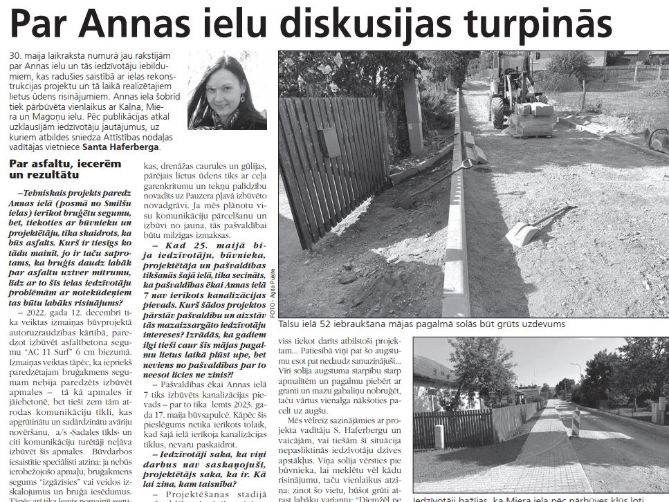 Šādu jautājumu mums uzdeva mājas Talsu ielā 52 īpašniece Dace – viņas īpašumam ir ieeja no Annas ielas, un pagalms, līdzīgi kā citās mājām šajā ielā, ir zemāks par ielu. Liels bija viņas pārsteigums, kad 7. jūnija pēcpusdienā vīri sāka ierīkot apmalītes pie viņas īpašuma, un, bija redzams, ka ielas līmenis būs tik augsts, ka diez vai būs iespējams pagalmā iebraukt ar automašīnu, atvest malku utt. Būvnieki piekrita, ka betona apmalītes ir augstas, taču viss tiekot darīts atbilstoši projektam… Patiesībā viņi pat šo augstumu esot pat nedaudz samazinājuši… Vīri solīja augstuma starpību starp apmalītēm un pagalmu piebērt ar granti un mazu gabaliņu nobruģēt, taču vārtus vienalga nākšoties pacelt uz augšu.