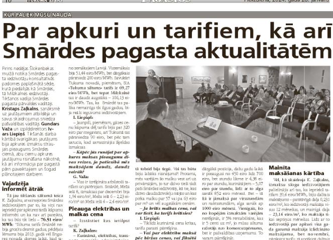 – Apkures tarifa pieaugums Smārdē bija pārsteigums, jo, šķita, ka par to deputāti domes sēdē nebija lēmuši. Liels bija pārsteigums, arī uzzinot, ka tarifs bez jelkādiem aprēķiniem bija iekļauts 2023. gada 30. novembra domes sēdes jautājumā par maksas pakalpojumiem. Un vēl var apšaubīt, vai jauno tarifu varēja piemērot no 1. decembra, jo nākamajā dienā pēc domes sēdes lēmumi noteikti nebija parakstīti, tie nebija arī publicēti. Tas, protams, nemaina faktu, ka tarifs vienalga būtu stājies spēkā…