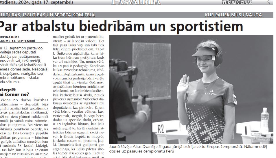 Dvarišķei un trenerim Zigfrīdam Markainim, kas no 27. septembra līdz 7. oktobrim startēs Pasaules čempionātā junioriem Limā, Peru. Kopumā šādas sacensības izmaksā vairāk nekā 4000 eiro, pašvaldības atbalsts, kā tas līdz šim bijis arī citos gadījumos, – 400 eiro apmērā katram. Pats lēmums gan vēl aizceļos uz finanšu komitejas sēdi un tad pieņemts 26. septembra domes sēdē.