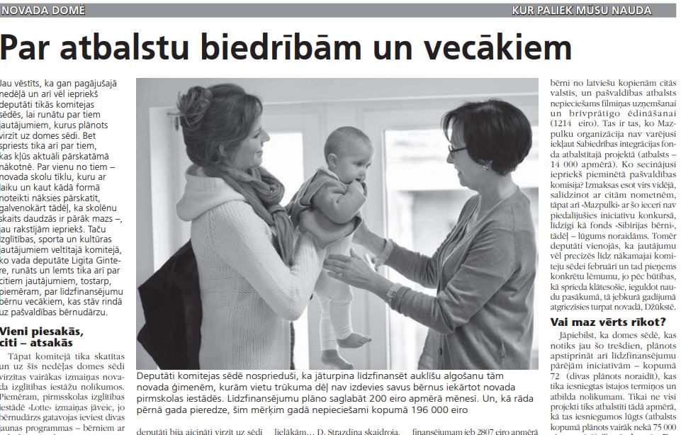 Bet nu, atgriežoties pie jautājuma par auklītēm. Kaut budžets vēl teorētiski nav pieņemts, šādos gadījumos nepieciešams turpinājums un deputāti bija aicināti virzīt uz sēdi lēmumprojektu par to, ka vecāki, kuru bērni neiet bērnudārzā, jo tajos nav vietas, var saņemt 200 eiro no pašvaldības. Pēc būtības tas ir kā līdzfinansējums izdevumiem auklīšu algošanai. (Arī līdzfinansējums privātajiem bērnudārziem tiek gatavots uz sēdi. – Red.) Saglabājot šādus pabalsta apmērus, tiek lēsts, ka gadā tam jāparedz 192 000 eiro, kas tā ir bijis arī pagājušajā gadā. Tajā pašā laikā šiem mērķiem pērn iztērēti ir vairāk nekā 196 000, – klātesošajiem skaidroja Izglītības pārvaldes juriste Gundega Guna Laganovska. Kārtība arī būs līdzšinējā, proti, vecāki, pirmkārt, ir iestājušies rindā uz bērnudārzu, otrkārt, slēdz līgumu ar bērna uzraudzības pakalpojuma sniedzēju, un tad dodas uz Izglītības pārvaldi, kur tiek kārtotas tālākās formalitātes. Deputāts Mārtiņš Limanskis vēl interesējās, kā veidojusies šī summa – 200 eiro – tā ir abstrakta summa, vai arī balstīta aprēķinos, cik vidēji izmaksā bērnu pieskatīšana pašvaldības dārziņos? Ja otrs variants, tad izmaksām šogad vajadzētu būt lielākām… D. Strazdiņa skaidroja, ka šī līdzfinansējuma jeb pabalsta apmērs nekad nav sedzis izmaksas pilnā apmērā, un ir pašvaldības, kur šīs summas ir mazākas vai pat nav nemaz. Un šobrīd, uzskata pārvaldes vadītāja, šo summu palielināt pašvaldība nevar atļauties, jo vajadzību ir daudz. Savukārt G. Važa piebilda, ka tas, protams, būtu atbalstāmi, ka šis pabalsts ir tādā apmērā, kā vidēji izmaksā viena bērna izglītošana pašvaldības dārziņā, bet, visticamāk, – perspektīvā, tāpēc priekšsēdētājs aicināja lēmumu virzīt tālāk esošajā versijā.