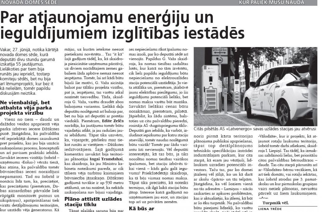 Tāpat plašākas saruna bija par vēl kādu “atjaunojamās enerģijas” jautājumu. Proti, pašvaldībā, iespējams, būs vairāk iespēju uzlādēt elektroauto. Un, lai šādas stacijas taptu, no pašvaldības puses nepieciešams rīkot īpašumu nomas izsoli, par ko deputāti sēdē arī vienojās. Papildus G. Važa skaidroja, ka nomas tiesības sadalītas lotēs, kur katrā no tām izvērtēts, cik liels papildu ieguldījums būtu nepieciešams no elektrouzlādes staciju potenciālā uzstādīja. Jo vieta attālāka un, piemēram, jāizbūvē jauns elektrības pieslēgums, jo šis ieguldījums potenciāli lielāks, bet nomas maksa varētu būt mazāka. Savukārt lielākas cenas būtu nosakāmas, piemēram, pilsētā. Jāpiebilst, ka šādu sistēmu, balstoties uz citu pašvaldību pieredzi, rosināja AS «Augstsprieguma tīkls». Deputāti gan iebilda, ka varbūt, izsludinot iepirkumu par katru staciju atsevišķi, tomēr naudas noslēgumā būtu vairāk? Tomēr par šādu variantu īsti nevienojās. Vēl deputāti interesējās, kā tas būs, ja tiks nosolītas nomas tiesības vairākos īpašumos, bet staciju izbūvēs tikai vienā – kāds galu galā ieguvums? Priekšsēdētājs skaidroja, ka tā būs vismaz nomas maksa. Tāpat tika precizēts, kā noteiks termiņus, cik ilgā laikā stacijai būtu jātop. Interese katrā gadījumā no uzņēmumiem jau esot, un stacijas top arī uz privātām zemēm.