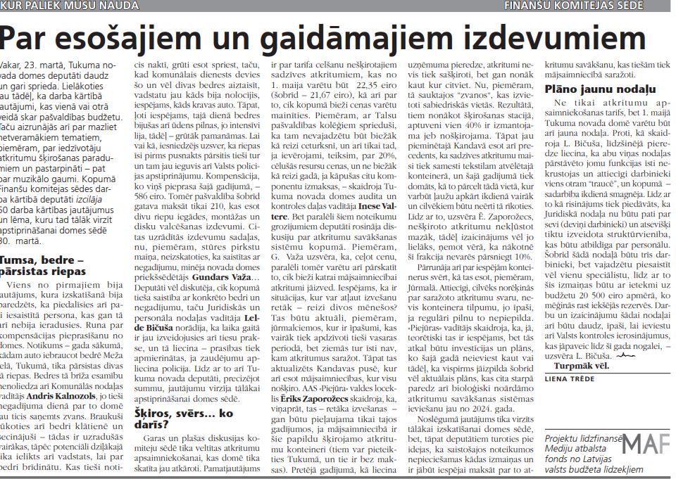 Garas un plašas diskusijas komiteju sēdē tika veltītas atkritumu apsaimniekošanai, kas domē tika skatīta jau atkāroti. Pamatjautājums ir par tarifa celšanu nešķirotajiem sadzīves atkritumiem, kas no 1. maijā varētu būt 22,35 eiro (šobrīd – 21,67 eiro), kā arī par to, cik kopumā bieži cenas varētu mainīties. Piemēram, ar Talsu pašvaldības kolēģiem sprieduši, ka tam nevajadzētu būt biežāk kā reizi ceturksnī, un arī tikai tad, ja ievērojami, teiksim, par 20%, cēlušās resursu cenas, un ne biežā kā reizi gadā, ja kāpušas citu komponentu izmaksas, – skaidroja Tukuma novada domes audita un kontroles daļas vadītāja Inese Valtere. Bet paralēli šiem noteikumu grozījumiem deputāti rosināja diskusiju par atkritumu savākšanas sistēmu kopumā. Piemēram, G. Važa uzsvēra, ka, ceļot cenu, paralēli tomēr varētu arī pārskatīt to, cik bieži katrai mājsaimniecībai atkritumus jāizved. Iespējams, ka ir situācijas, kur var atļaut izvēšanu retāk – reizi divos mēnešos? Tas būtu aktuāli, piemēram, jūrmalciemos, kur ir īpašumi, kas vairāk tiek apdzīvoti tieši vasaras periodā, bet ziemās tur īsti nav, kam atkritumus saražot. Tāpat tas aktualizēts Kandavas pusē, kur arī esot mājsaimniecības, kur visu nošķiro. AAS «Piejūra» valdes loceklis Ēriks Zaporožecs skaidroja, ka, viņaprāt, tas – retāka izvešanas – gan būtu pieļaujama tikai tajos gadījumos, ja mājsaimniecībā ir šie papildu šķirojamo atkritumu konteineri (tiem var pieteikties Tukumā un tie ir bez maksas). Pretējā gadījumā un uzņēmuma pieredzes liecina, ka atkritumi nevis tiek sašķiroti, bet gan nonāk kaut kur citviet. Nu, piemēram, tā sauktajos “zvanos“, kas izvietoti sabiedriskās vietās. Rezultātā, tiem nonākot šķirošanas stacijā, aptuveni vien 40% ir izmantojama jeb nošķirojama. Tāpat jau pieminētajā Kandavā esot arī precedents, ka sadzīves atkritumu maisi tiek samesti tekstilam atvēlētajā konteinerā, un šajā gadījumā tiek domāts, kā to pārcelt tādā vietā, kur varbūt ļaužu apkārt ikdienā vairāk un cilvēkiem būtu varbūt neērti tā rīkoties. Līdz ar to, uzsvēra Ē. Zaporožecs, nešķiroto atkritumu nekļūstot mazāk, tādēļ izaicinājums vēl jo lielāks, ņemot vērā, ka nākotnē šī frakcija nevarēs pārsniegt 10%.