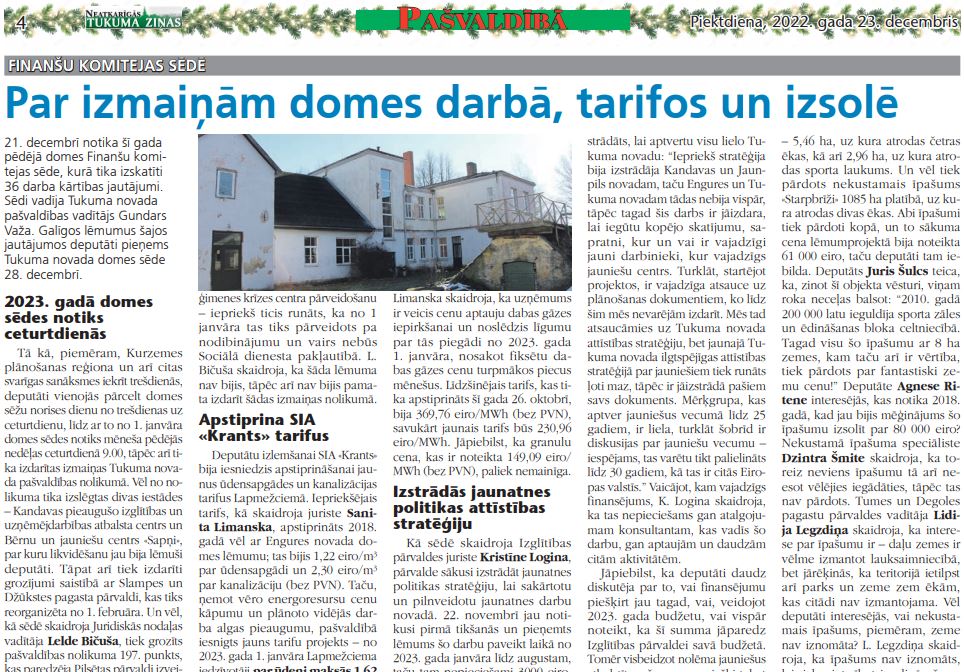 Deputātu izlemšanai SIA «Krants» bija iesniedzis apstiprināšanai jaunus ūdensapgādes un kanalizācijas tarifus Lapmežciemā. Iepriekšējais tarifs, kā skaidroja juriste Sanita Limanska, apstiprināts 2018. gadā vēl ar Engures novada domes lēmumu; tas bijis 1,22 eiro/m³ par ūdensapgādi un 2,30 eiro/m³ par kanalizāciju (bez PVN). Taču, ņemot vēro energoresursu cenu kāpumu un plānoto vidējās darba algas pieaugumu, pašvaldībā iesnigts jauns tarifu projekts – no 2023. gada 1. janvāra Lapmežciema iedzīvotāji par ūdeni maksās 1,62 eiro/m³ bez PVN, savukārt par kanalizāciju – 2,70 eiro bez PVN. Uzņēmums arī jau laikus bija iedzīvotājus brīdinājis par šīm izmaiņām. Deputātiem jautājumu vai iebildumu par tarifa pieaugumu nebija.