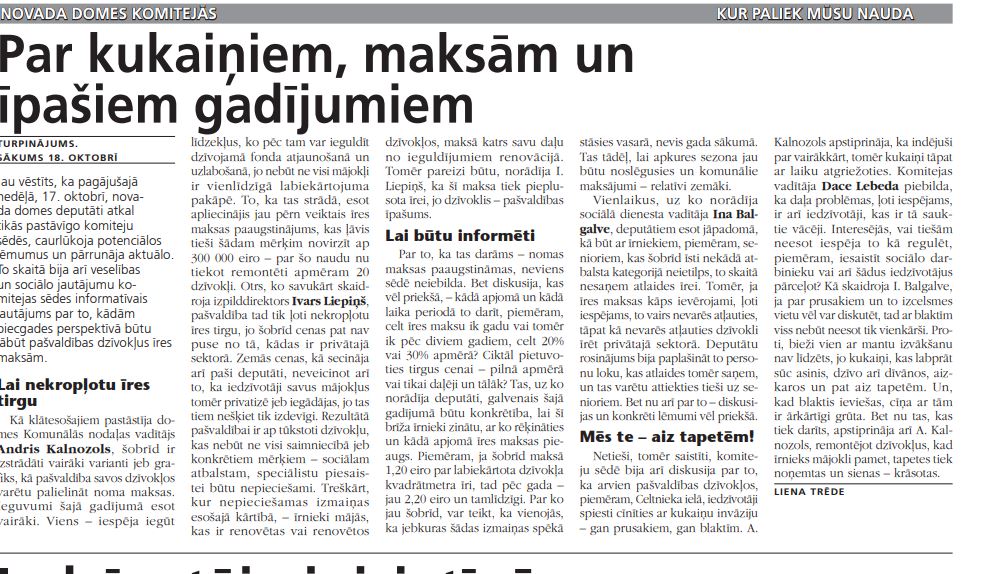 Kā klātesošajiem pastāstīja domes Komunālās nodaļas vadītājs Andris Kalnozols, šobrīd ir izstrādāti vairāki varianti jeb grafiks, kā pašvaldība savos dzīvokļos varētu palielināt noma maksas. Ieguvumi šajā gadījumā esot vairāki. Viens – iespēja iegūt līdzekļus, ko pēc tam var ieguldīt dzīvojamā fonda atjaunošanā un uzlabošanā, jo nebūt ne visi mājokļi ir vienlīdzīgā labiekārtojuma pakāpē. To, ka tas strādā, esot apliecinājis jau pērn veiktais īres maksas paaugstinājums, kas ļāvis tieši šādam mērķim novirzīt ap 300 000 eiro – par šo naudu nu tiekot remontēti apmēram 20 dzīvokļi. Otrs, ko savukārt skaidroja izpilddirektors Ivars Liepiņš, pašvaldība tad tik ļoti nekropļotu īres tirgu, jo šobrīd cenas pat nav puse no tā, kādas ir privātajā sektorā. Zemās cenas, kā secināja arī paši deputāti, neveicinot arī to, ka iedzīvotāji savus mājokļus tomēr privatizē jeb iegādājas, jo tas tiem nešķiet tik izdevīgi. Rezultātā pašvaldībai ir ap tūkstoti dzīvokļu, kas nebūt ne visi saimniecībā jeb konkrētiem mērķiem – sociālam atbalstam, speciālistu piesaistei būtu nepieciešami. Treškārt, kur nepieciešamas izmaiņas esošajā kārtībā, – īrnieki mājās, kas ir renovētas vai renovētos dzīvokļos, maksā katrs savu daļu no ieguldījumiem renovācijā. Tomēr pareizi būtu, norādīja I. Liepiņš, ka šī maksa tiek pieplusota īrei, jo dzīvoklis – pašvaldības īpašums.