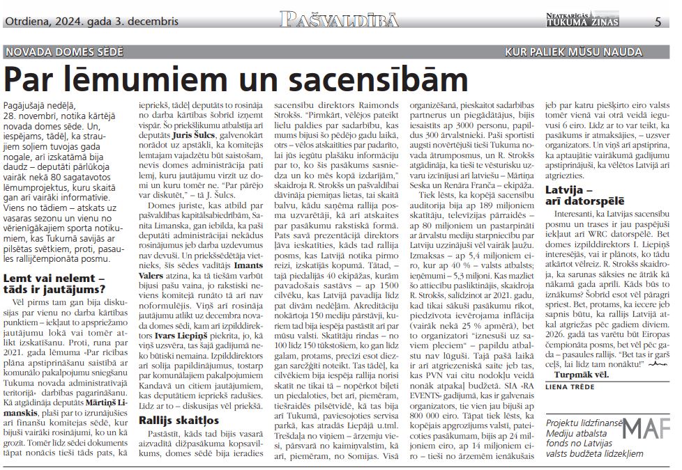 Pastāstīt, kāds tad bijis vasarā aizvadītā dižpasākuma kopsavilkums, domes sēdē bija ieradies sacensību direktors Raimonds Strokšs. “Pirmkārt, vēlējos pateikt lielu paldies par sadarbību, kas mums bijusi šo pēdējo gadu laikā, otrs – vēlos atskaitīties par padarīto, lai jūs iegūtu plašāku informāciju par to, ko šis pasākums sasniedza un ko mēs kopā izdarījām,” skaidroja R. Strokšs un pašvaldībai dāvināja piemiņas lietas, tai skaitā balvu, kādu saņēma rallija posma uzvarētāji, kā arī atskaites par pasākumu rakstiskā formā. Pats savā prezentācijā direktors ļāva ieskatīties, kāds tad rallija posms, kas Latvijā notika pirmo reizi, izskatījās kopumā. Tātad, – tajā piedalījās 40 ekipāžas, kurām pavadošais sastāvs – ap 1500 cilvēku, kas Latvijā pavadīja līdz pat divām nedēļām. Akreditāciju nokārtoja 150 mediju pārstāvji, kuriem tad bija iespēja pastāstīt arī par mūsu valsti. Skatītāju rindas – no 100 līdz 150 tūkstošiem, ko gan līdz galam, protams, precīzi esot diezgan sarežģīti noteikt. Tas tādēļ, ka cilvēkiem bija iespēja rallija norisi skatīt ne tikai tā – nopērkot biļeti un piedaloties, bet arī, piemēram, tiešraidēs pilsētvidē, kā tas bija arī Tukumā, paviesojoties servisa parkā, kas atradās Liepājā u.tml. Trešdaļa no viņiem – ārzemju viesi, kur lielākā daļa no kaimiņvalstīm, kā arī, piemēram, no Somijas. Visā organizēšanā, pieskaitot sadarbības partnerus un piegādātājus, bijis iesaistīts ap 3000 personu, papildus 300 ārvalstnieki. Paši sportisti augsti novērtējuši tieši Tukuma novada ātrumposmus, un R. Strokšs atgādināja, ka tieši te vēsturisku uzvaru izcīnījusi arī latviešu – Mārtiņa Seska un Renāra Franča – ekipāža.