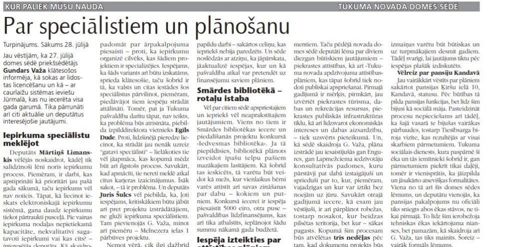 Līdz šim, kā liek secināt domes sēdēs dzirdētais, sabiedrība diez ko aktīvi neizmanto savu iespēju iesaistīties diskusijās, piemēram, par un ap saistošajiem noteikumiem, pirms tos apstiprina gala variantā. Līdzīgi sokas ar plānošana dokumentiem. Taču pēdējā novada domes sēdē deputāti lēma par diviem diezgan būtiskiem jautājumiem – piekrastes attīstības, kā arī «Tukuma novada