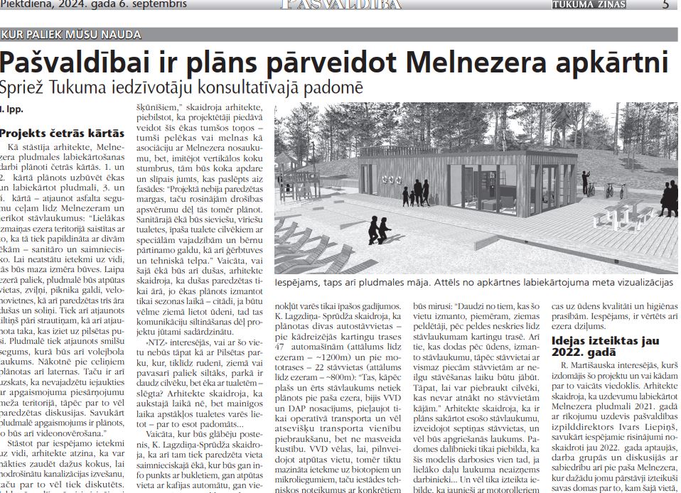 Melnezers un tā pludmale ir lielākā atpūtas vieta pie ūdens pilsētā vai, pareizāk, tuvu tai, kas turklāt tiek izmantota visu gadu. Gadiem, pat gadu desmitiem tukumnieki aicinājuši šo vietu labiekārtot, taču sarežģītais ezera novietojums – Latvijas valsts mežu teritorijā un vēl salīdzinoši nesen Engures novadā, turklāt ciešā biotopu un liegumu tuvumā – jelkādus risinājumus ierobežoja. Pēc administratīvās reformas Melnezers nu ir Tukuma novadā, bet pēc daudzām sarunām ar LVM ir panākta vienošanās par plašākiem darbiem, kas ļautu nodrošināt gan ērtas tualetes un pārģērbšanās kabīnes, gan izveidot atpūtas vietas, kā to redz SIA «Landshape» (skatīt attēlus) projekts. Piedāvātie risinājumi Melnezera pludmales un apkārtnes labiekārtošanai 27. augustā tika pārrunāti Tukuma pilsētas iedzīvotāju konsultatīvās padomes sēdē, kur ar projekta risinājumiem iepazīstināja arhitekte Katrīna Lagzdiņa-Sprūdža.