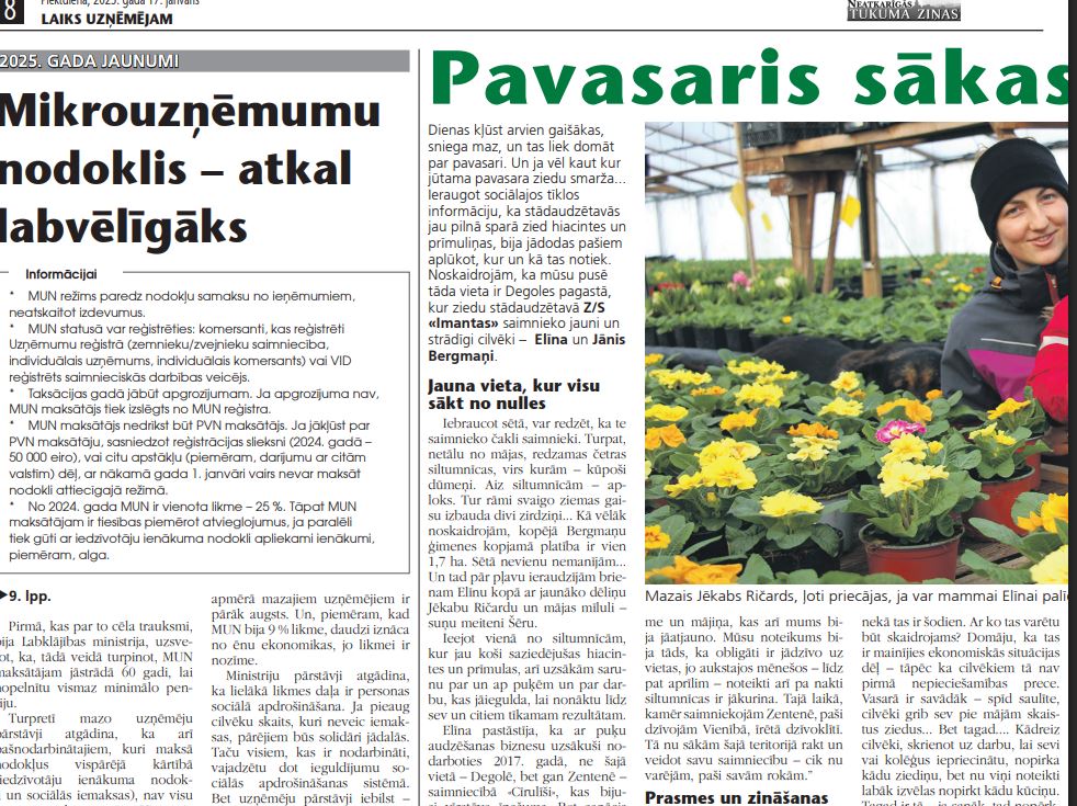 ”Iesākām saimniecību ZS «Imantas» ar vienu siltumnīcu. Nu esam izauguši jau līdz četrām. Trīs no tām ir apkurināmas, un, jāsaka, ka tas ir atliektiem galiem – pietiekoši, jo ziemas tirgus ir palicis sliktāks. Jā, kādreiz arī pavasara ziedus pirka daudz labāk, nekā tas ir šodien. Ar ko tas varētu būt skaidrojams? Domāju, ka tas ir mainījies ekonomiskās situācijas dēļ – tāpēc ka cilvēkiem tā nav pirmā nepieciešamības prece. Vasarā ir savādāk – spīd saulīte, cilvēki grib sev pie mājām skaistus ziedus… Bet tagad…. Kādreiz cilvēki, skrienot uz darbu, lai sevi vai kolēģus iepriecinātu, nopirka kādu ziediņu, bet nu viņi noteikti labāk izvēlas nopirkt kādu kūciņu. Tagad ir tā – ja sanāk, tad nopērk, bet tas nav bieži. Pagājušā gadā 8. martu uzsākām arī tulpju audzēšanu. Bet jāsaka, ka šajā nozarē, tāpat kā jebkurā citā, ir ļoti grūti uzsākt darīt kaut ko jaunu – mūsu gadījumā sākt audzēt kaut tādu, ko nemākam. Ar vasaras puķēm nebija problēmu – zināju, kas un kā jādara, – to iemācījos no saviem vecākiem. Bet uzsākt audzēt jaunu kultūru – ir grūti. Mums paveicās, jo pagājušais gads ar tulpēm bija labs – visas izpirka un to pat pietrūka. Tās mums izedavās ļoti skaistas – zemas un stingras… Jāsaka, ka mums veiksme uzsmaidīja arī ar to, ka trīs dienas pirms 8. marta spīdēja saulīte, jo, ja tā nebūtu, visas tulpes būtu tikai ar zaļiem pumpuriem. Mēs nedomājām, ka tās pāris reizes, kad nepakurinājām siltumnīcu, tik daudz ko izteiks… Ir jānāk, jākurina ikdienu, un divus mēnešus jānotur aptuveni 15-18°C grādi. Mēs mazliet paslinkojām, domājām, gan jau būs labi, bet beigās nokavējām. Un tādus zaļu pumpurus jau cilvēki pirkt nevēlētos… Taču tie bija tūkstoši latu, kas ir ieguldīti sīpolu iegādē, un mēs apzinājāmies: ja nepārdodam tajā dienā, tad ikdienā mēs vairs tik daudz nepārdosim. Bet viss beidzās veiksmīgi…