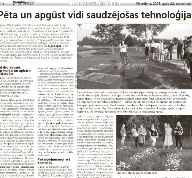 Lauku dienu programmā bija noorganizēta iepazīšanas ar projekta «Eiropas Zaļā kursa noteikto vidi saudzējošo tehnoloģisko risinājumu izstrāde un ieviešana dārzkopībā Latvijā» (Greenhort) rezultātiem un atziņām. Šī projekta mērķis bija saprast, kā jauktie stādījumi darbojas gan, piesaistot augsnei slāpekli, gan, palielinot tajā organisko vielu daudzumu un ierobežojot kaitēkļus un slimības. Tātad projekta uzdevums bija noskaidrot, kādā veidā šiem nolūkiem varam izmantot pakalpojuma augus. Projekta dalībnieki bijuši gan zinātnieki, gan arī lauksaimnieki: Andra Manguļa zemnieku saimniecība «Atvases» Daugmalē un Lienas Mucenieces saimniecība «LM Product» no Lielvārdes. Kā, sarunu aizsākot, pastāstīja L. Lepse, tad zinātnisko publikāciju par jauktiem stādījumiem mūsu klimatiskajā zonā ir ļoti maz. Tāpēc nereti, veicot pētījumus, gadās tā, ka jautājumu rodas daudz vairāk nekā atbilžu un tātad izmēģinājumus vajadzētu vēl turpināt, tomēr finansējums paredzēts tikai trim gadiem. Izmēģinājumu rezultātus ietekmē arī ik gadus mainīgie klimatiskie apstākļi.