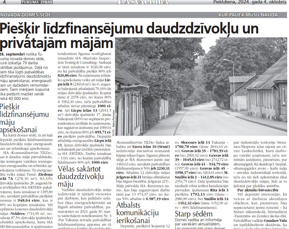 Pašvaldības atbalstu saņēma arī vairākas SIA «Komunālserviss «TILDe» apsaimniekotās daudzdzīvokļu mājas Lapmežciemā. Stadiona ielas 34. nama (264,2 m²) dzīvokļu īpašnieki (90%) par tehniskās apsekošanas veikšanu bija nobalsojuši 3. jūnijā, un pēc cenu aptaujas no sešiem pretendentiem līguma noslēgšanai izraudzīts SIA «Marčuks Inspection Testing & Consulting». Saskaņā ar tāmi izmaksas ir 1026,08 eiro, no kā pašvaldība piešķir 80% jeb 820,86 eiro. Šis uzņēmums tehnisko apsekošanu veiks arī mājai Liepu ielā 9 (2360,8 m²), ko 6. augusta balsojumā atbalstījuši 79,16% šīs mājas dzīvokļu īpašnieku. Kopējā tāme ir 2378 eiro, no kuras 80% ir 1902,40 eiro, taču pašvaldības atbalsts nevar pārsniegt 1000 eiro. Arī Liepu ielas 13 (2941,5 m²) dzīvokļu īpašnieki 17. jūnija balsojumā (81%) no septiņiem pretendentiem izvēlējās šo uzņēmumu, kas sagatavos atzinumu par 1069,64 eiro, no kuriem 80% jeb 855,71 eiro piešķirs pašvaldība. Deputāti atbalstīja energoauditu Liepu ielā 11, kuras dzīvokļu īpašnieki bija nobalsojuši par izvēlēto pretendentu SIA «ERTEKS». Darbu izmaksas – 1331 eiro, no kurām pašvaldība līdzfinansēs 80% jeb 1000 eiro.