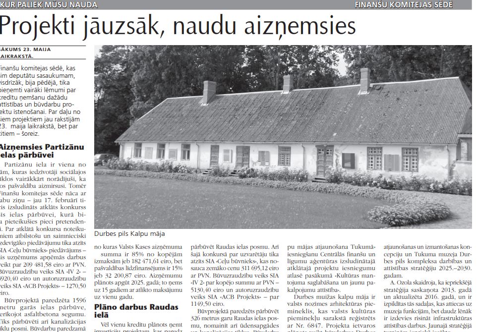 Deputāti atbalstīja projekta pieteikuma «Durbes muižas kalpu mājas atjaunošana Tukumā» iesniegšanu Centrālās finanšu un līgumu aģentūras izsludinātajā atklātajā projektu iesniegumu atlasē pasākumā «Kultūras mantojuma saglabāšana un jaunu pakalpojumu attīstība».