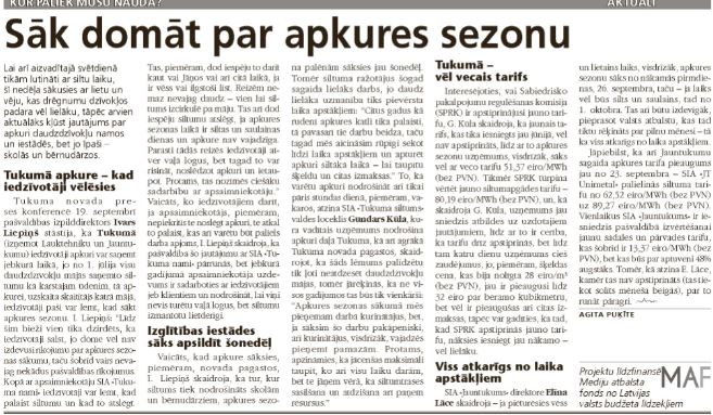 Tukuma novada preses konferencē 19. septembrī pašvaldības izpilddirektors Ivars Liepiņš stāstīja, ka Tukumā (izņemot Lauktehniku un Jauntukumu) iedzīvotāji apkuri var saņemt jebkurā laikā, jo kopš no 1. jūlija visu daudzdzīvokļu mājās saņemto siltumu kā karstajam ūdenim, tā apkurei, uzskaita skaitītājs katrā mājā, iedzīvotāji paši var lemt, kad sākt apkures sezonu. I. Liepiņš: “Līdz šim bieži vien tika dzirdēts, ka iedzīvotāji salst, jo dome vēl nav izdevusi rīkojumu par apkures sezonas sākumu, taču šobrīd vairs nevajag nekādus pašvaldības rīkojumus. Kopā ar apsaimniekotāju SIA «Tukuma nami» iedzīvotāji var lemt, kad palaist siltumu un kad to atslēgt. Tas, piemēram, dod iespēju to darīt kaut vai Jāņos vai arī citā laikā, ja ir vēss vai ilgstoši līst. Reizēm nemaz nevajag daudz – vien lai siltums izcirkulē pa māju. Tas arī dod iespēju siltumu atslēgt, ja apkures sezonas laikā ir siltas un saulainas dienas un apkure nav vajadzīga. Parasti tādās reizēs iedzīvotāji atver vaļā logus, bet tagad to var risināt, noslēdzot apkuri un ietaupot. Protams, tas nozīmēs ciešāku sadarbību ar apsaimniekotāju.” Vaicāts, ko iedzīvotājiem darīt, ja apsaimniekotājs, piemēram, nepiekritīs te noslēgt apkuri, te atkal to palaist, kas arī varētu būt paliels darba apjoms, I. Liepiņš skaidroja, ka pašvaldība šo jautājumu ar SIA «Tukuma nami» pārrunās, bet jebkurā gadījumā apsaimniekotāja uzdevums ir sadarboties ar iedzīvotājiem jeb klientiem un nodrošināt, lai viņi nevis turētu vaļā logus, bet siltumu izmantotu lietderīgi.
