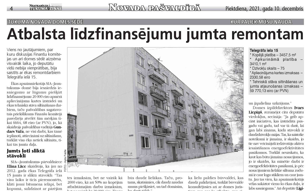 SIA« «Jauntukums» pārvaldniece Elīna Lāce skaidroja, ka jau no 2012. gada ēkas Telegrāfa ielā 15 jumts ir sliktā stāvoklī: “Tas visu laiku ir ticis pieremontēts, klāti jauni bitumena ielāpi, bet kopumā, salīdzinot ar pārējām daudzdzīvokļu mājām mikrorajonā, šīs ēkas jumts jau tolaik bija un joprojām ir vissliktākajā stāvoklī. Turklāt bojājumu dēļ pat applūduši dzīvokļi. Ir vairāki ekspertu atzinumi, kuros norādīts par jumta slikto stāvoklī, tāpēc ir kaut kas jādara. Mājai pašai uzkrājumā nav tik daudz naudaas, lai visus šos darbus finansētu, tāpēc lūdzam pašvaldības līdzfinansējumu. Un ar visu to apsaimniekotājam vēl būs jāiegulda kādi 10 000 eiro, lai sakārtotu jumtu.” E. Lāce atzina, ka var gaidīt avārijas situāciju, kas tuvākajā laikā var arī pienākt, jo jau tagad pa elektrības vadiem ēkā ieplūst ūdens: “Nav pat jēgas veikt citus darbus, kamēr jumts nav sakārtots. Turklāt – palielinot tehniskā stāva siltinājuma biezumu atbilstoši nosacījumiem, izmaksas sadārdzinājušās par aptuveni 12 000 eiro, kas prasa vairāk naudas no mājas un apsaimniekotāja.”
