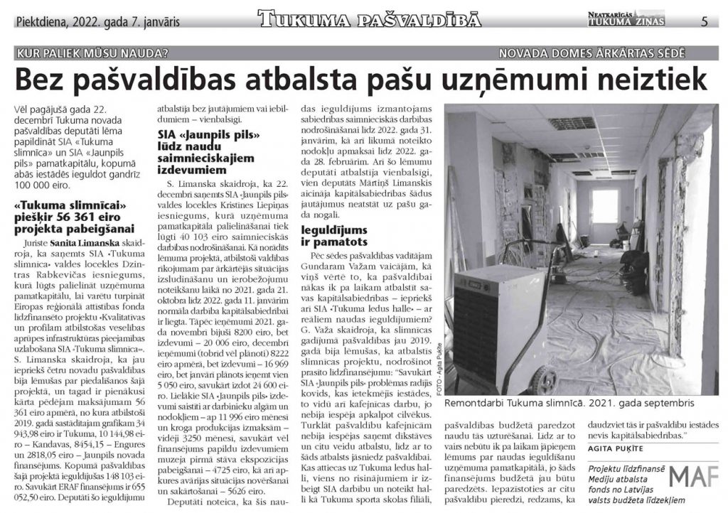 Juriste Sanita Limanska skaidroja, ka saņemts SIA «Tukuma slimnīca» valdes locekles Dzintras Rabkevičas iesniegums, kurā lūgts palielināt uzņēmuma pamatkapitālu, lai varētu turpināt Eiropas reģionālā attīstības fonda līdzfinansēto projektu «Kvalitatīvas un profilam atbilstošas veselības aprūpes infrastruktūras pieejamības uzlabošana SIA «Tukuma slimnīca»». S. Limanska skaidroja, ka jau iepriekš četru novadu pašvaldības bija lēmušas par piedalīšanos šajā projektā, un tagad ir pienākusi kārta pēdējam maksājumam 56 361 eiro apmērā, no kura atbilstoši 2019. gadā sastādītajam grafikam 34 943,98 eiro ir Tukuma, 10 144,98 eiro – Kandavas, 8454,15 – Engures un 2818,05 eiro – Jaunpils novada finansējums. Kopumā pašvaldības šajā projektā ieguldījušas 148 103 eiro. Savukārt ERAF finansējums ir 655 052,50 eiro. Deputāti šo ieguldījumu atbalstīja bez jautājumiem vai iebildumiem – vienbalsīgi.
