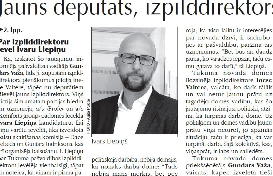 Kā, izskatot šo jautājumu informēja pašvaldības vadītājs Gundars Važa, līdz 5. augustam izpilddirektora pienākumus pildīja Inese Valtere, tāpēc nu deputātiem jāievēl jauns izpilddirektors. Viņš virzīja šim amatam partijas biedra un uzņēmēja, a/s «Profe» un a/s «Komforts group» padomes locekļa Ivara Liepiņa kandidatūru. Lai viņu varētu ievēlēt, tika izveidota balsu skaitīšanas komisija – Dace Lebeda un Guntars Indriksons, kas arī organizēja balsošanu. I. Liepiņu par Tukuma pašvaldības izpilddirektoru ievēlēja vienbalsīgi, tāpat arī noteica, ka viņam ir pirmā paraksta tiesības un atļauja ieņemt administrācijas vadītāja amatu. G. Važa teica paldies I. Valterei par paveikto un vēlēja izdošanos I. Liepiņam, šos pienākumus uzņemoties.