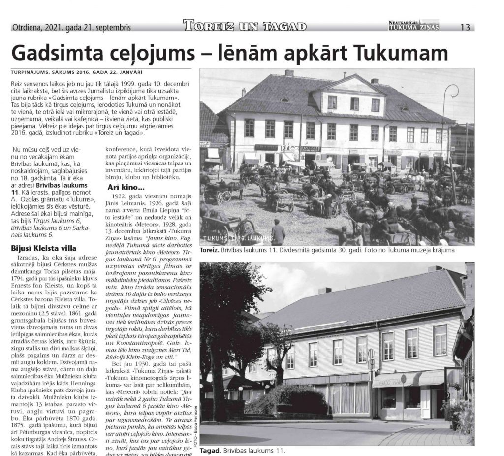 Nu mūsu ceļš ved uz vienu no vecākajām ēkām Brīvības laukumā, kas, kā noskaidrojām, saglabājusies no 18. gadsimta. Tā ir ēka ar adresi Brīvības laukums 11. Kā ierasts, palīgos ņemot A. Ozolas grāmatu «Tukums», ielūkojāmies šīs ēkas vēsturē. Adrese šai ēkai bijusi mainīga, tas bijis Tirgus laukums 6, Brīvības laukums 6 un Sarkanais laukums 6.
